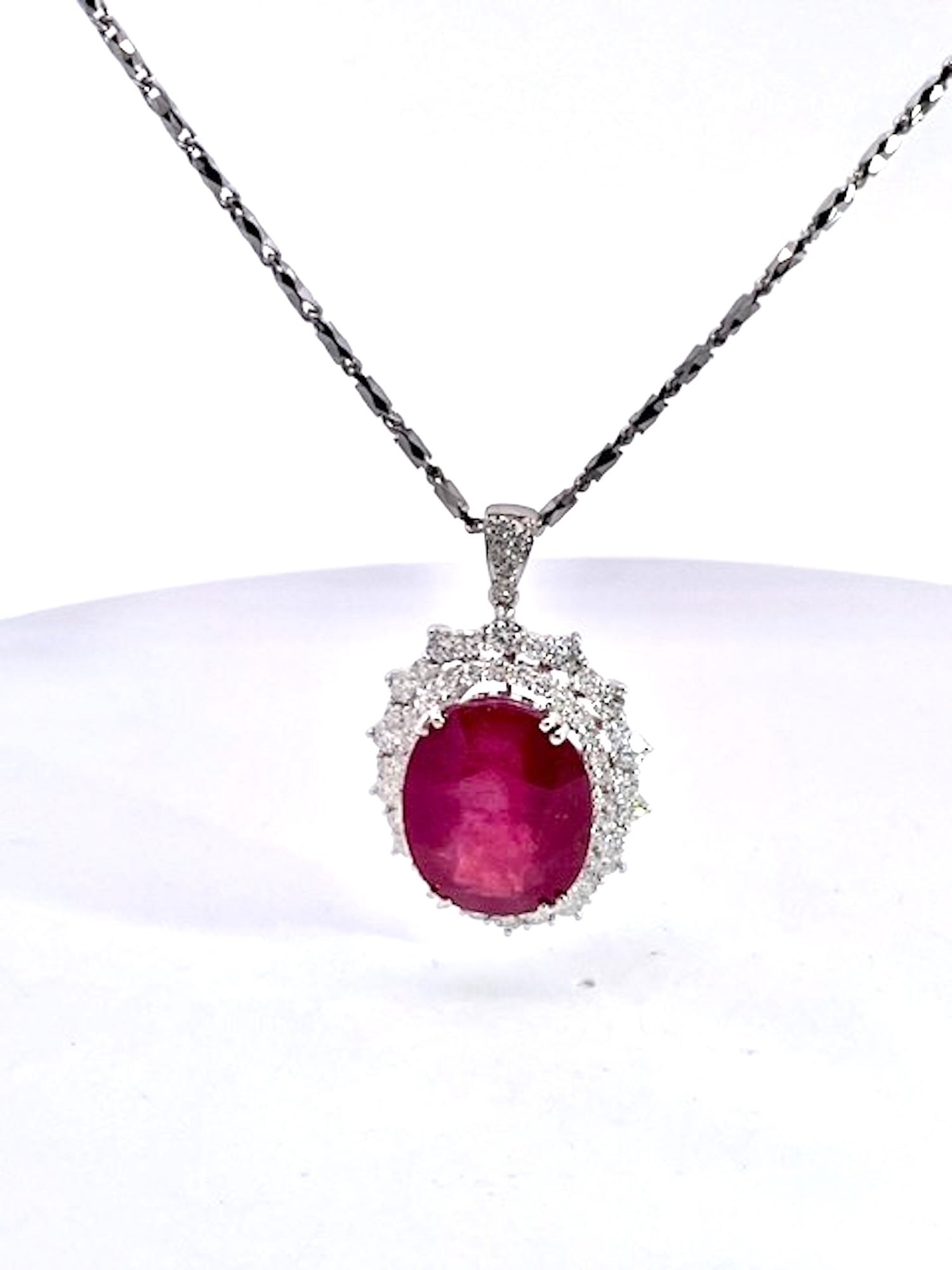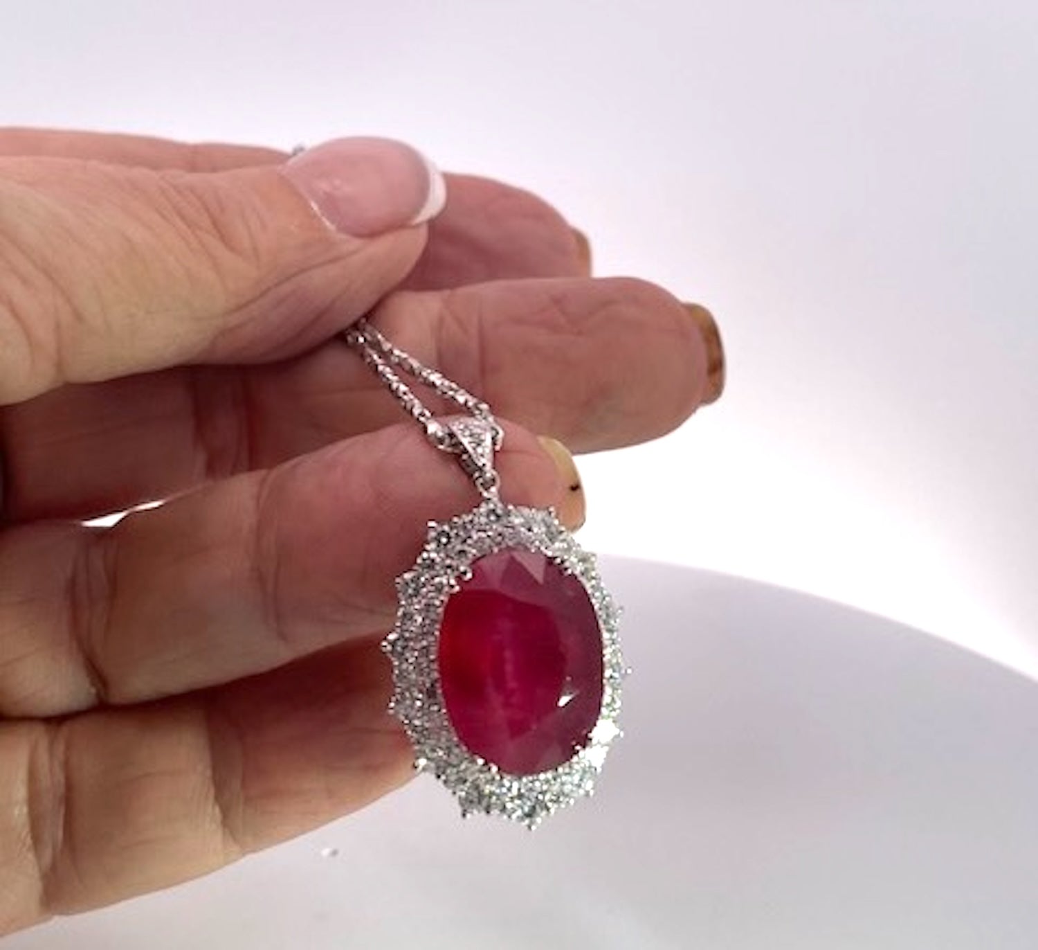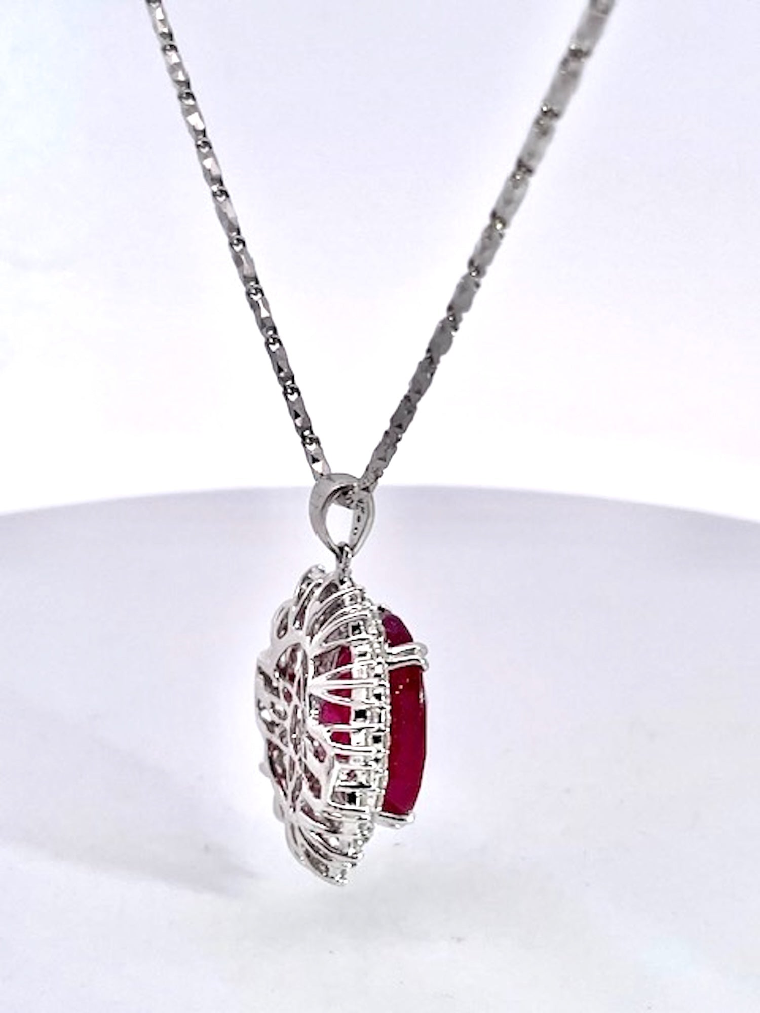 A stunning pendant necklace featuring a large, oval-cut ruby as its centerpiece, displaying a rich, vivid crimson-red hue with excellent depth and brilliance. The ruby is 17.59 carats elegantly framed by a double halo of sparkling round-cut diamonds of 2.21 carats, set in 18K white gold, creating a luxurious starburst effect around the gemstone. Larger accent diamonds are strategically placed at cardinal points, adding extra radiance. The pendant is suspended from a delicate, faceted box-link chain in matching white metal, which catches the light beautifully. The overall design exudes classic sophistication with a regal quality, reminiscent of fine estate jewelry. The combination of the deep red ruby against the brilliant white diamonds creates a striking, high-contrast piece of exceptional elegance.