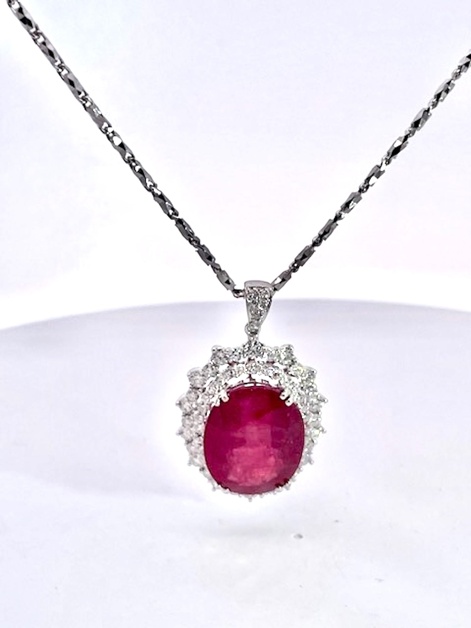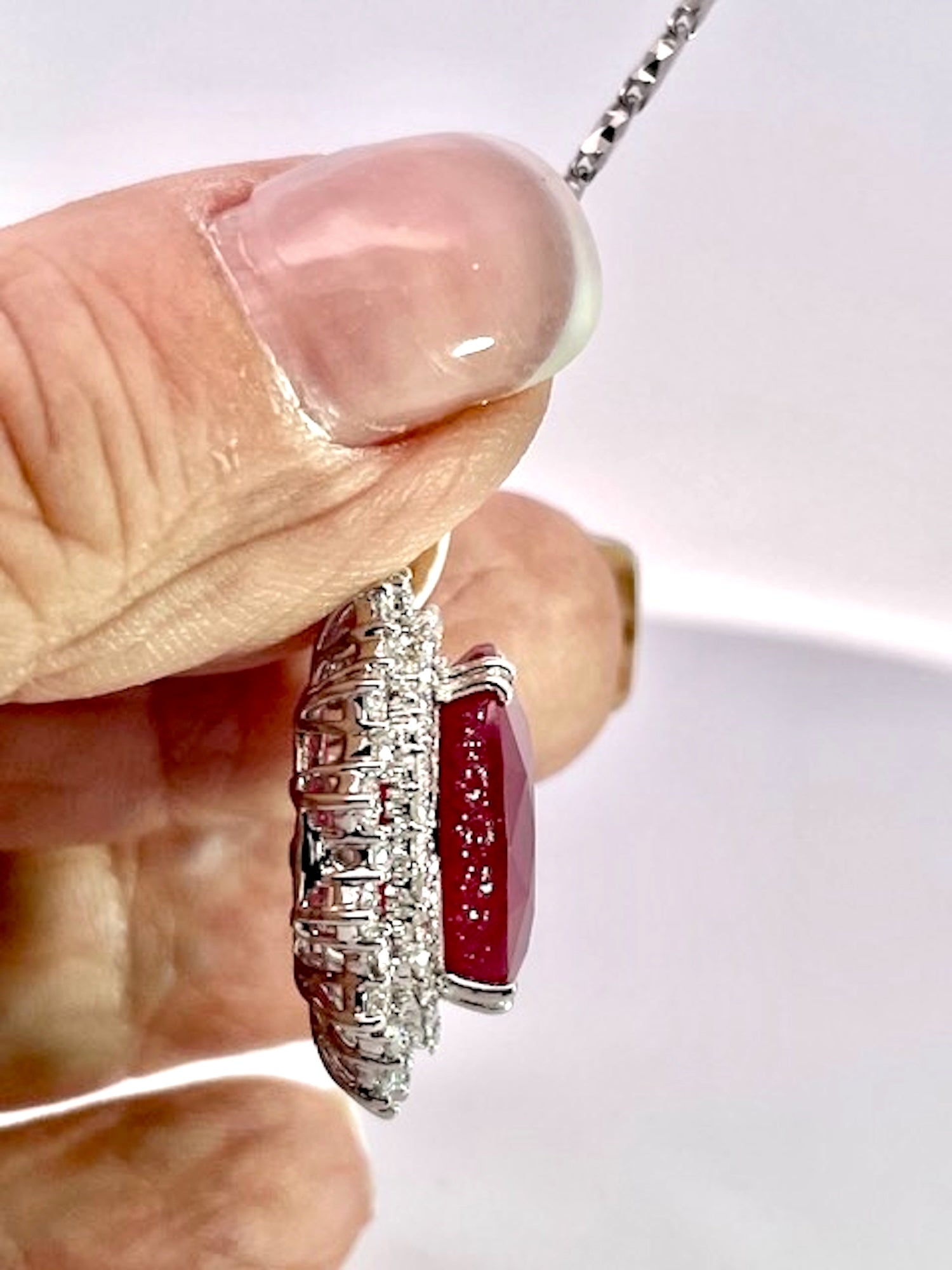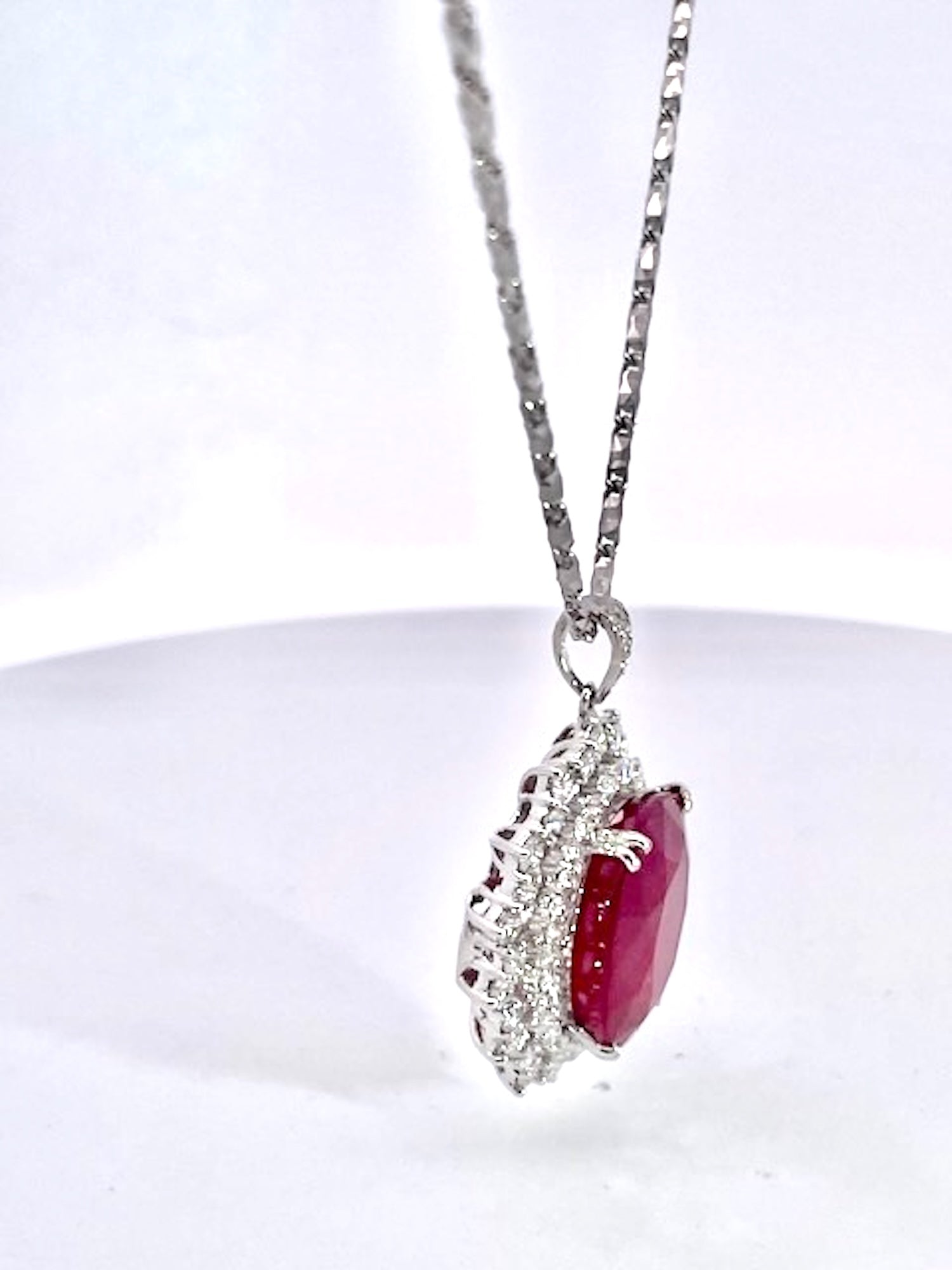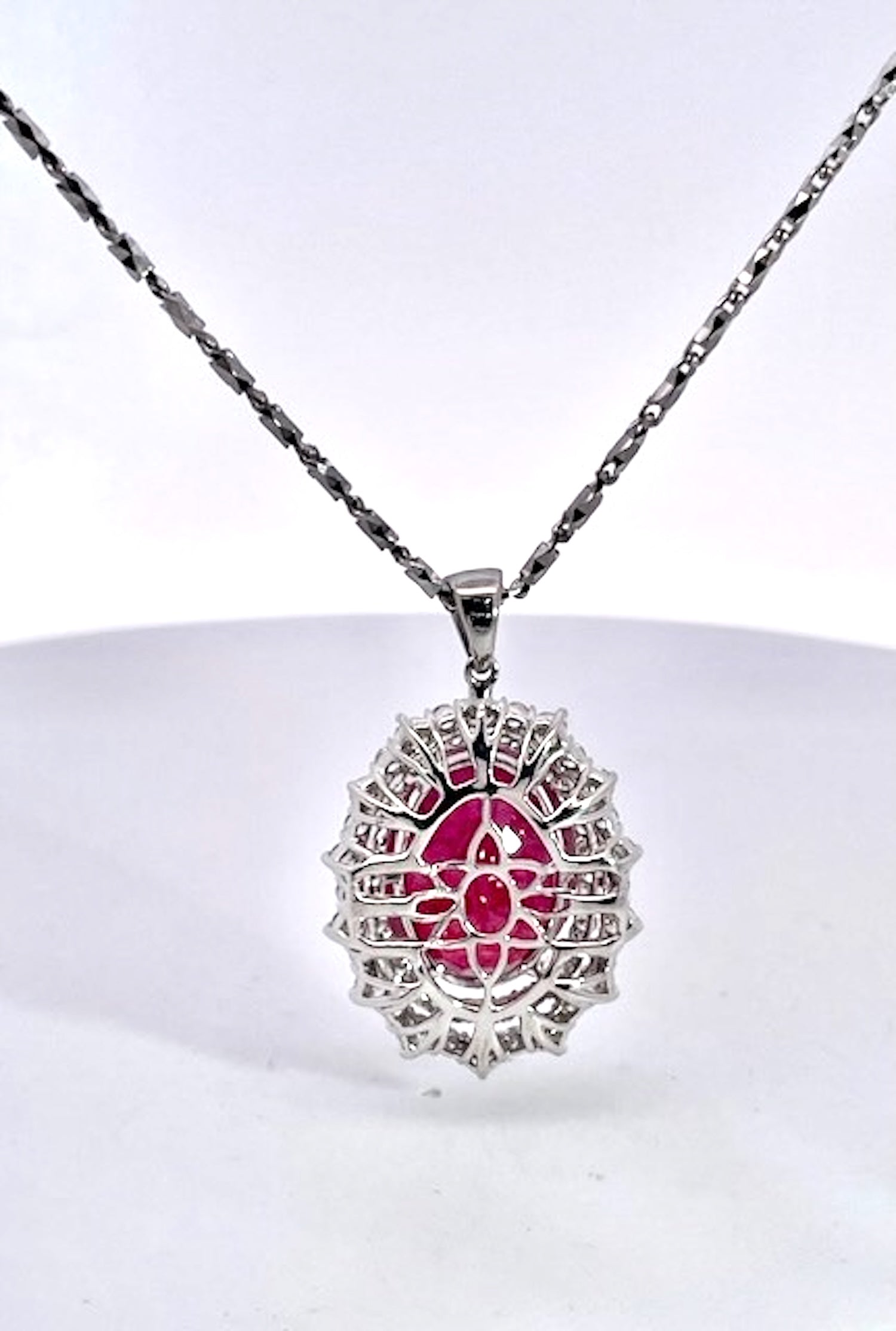 A stunning pendant necklace featuring a large, oval-cut ruby as its centerpiece, displaying a rich, vivid crimson-red hue with excellent depth and brilliance. The ruby is 17.59 carats elegantly framed by a double halo of sparkling round-cut diamonds of 2.21 carats, set in 18K white gold, creating a luxurious starburst effect around the gemstone. Larger accent diamonds are strategically placed at cardinal points, adding extra radiance. The pendant is suspended from a delicate, faceted box-link chain in matching white metal, which catches the light beautifully. The overall design exudes classic sophistication with a regal quality, reminiscent of fine estate jewelry. The combination of the deep red ruby against the brilliant white diamonds creates a striking, high-contrast piece of exceptional elegance.