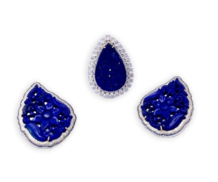 This Carved Lapis Ring is special and it matches another of my listings for Earrings.Β This is a beautiful blue with no pyrite just very clean.Β This ring has a large Lapis stone which is 18.90 carats and includes a small Diamond border with 0.47 carats and then beautiful moonstones total 31 stones with a carat weight of 4.66 carats.Β All in all this is 2...