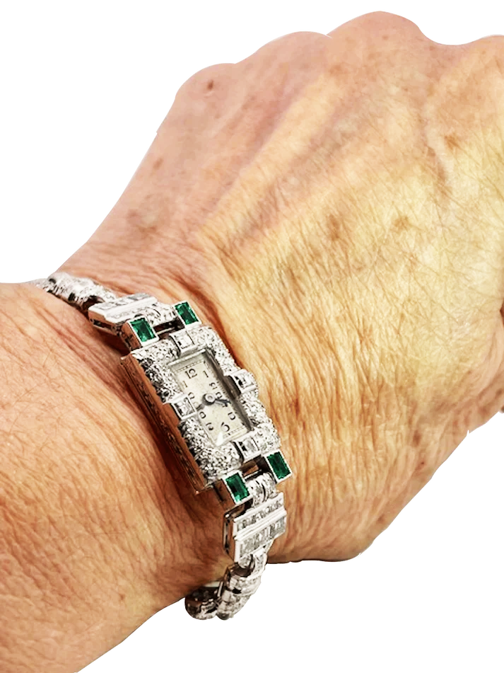 This wristwatch is special as it is all Diamonds with 4 square Emerald stones each .20 to total .80 carats the balance is Diamonds in round cuts, baguette cuts. There is approximately 3 carats of Diamonds on the bracelet itself. The watch features Black numbers in a fully detailed melle diamond surround, with Round and square Diamonds accents. This bracelet weights in at 29.33grams and it's length is 6.5. I own many Deco watches to match what jewels I am wearing. Ruby, Sapphire and Emerald. Occasionally I will buy some retro watches those I like in Rubies but for Deco, Emerald and Sapphire are the best. This watch is special I would not wait, it just might begone