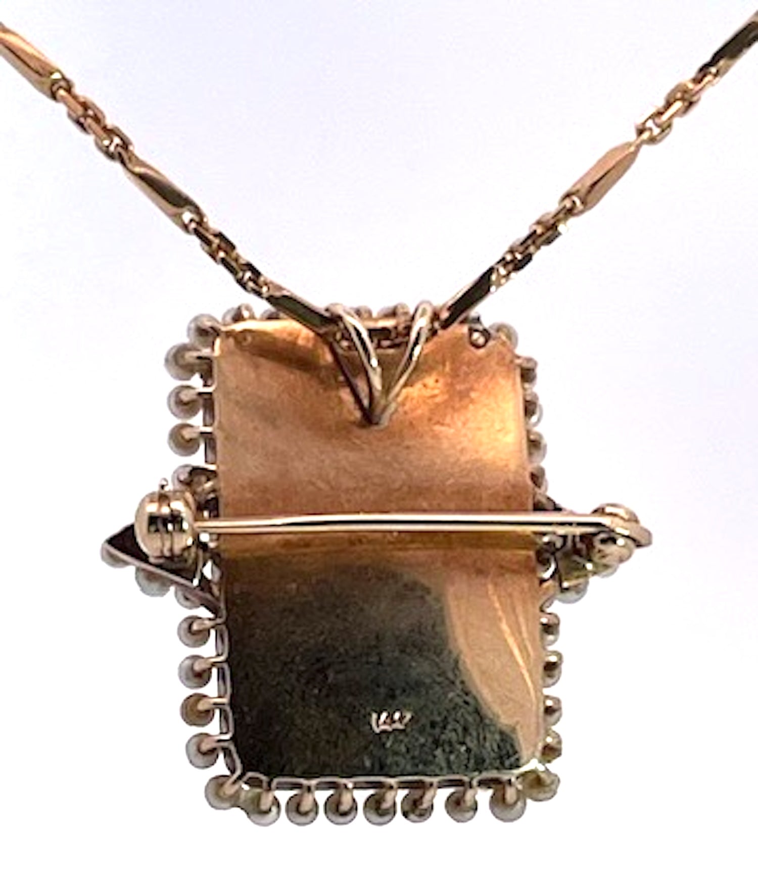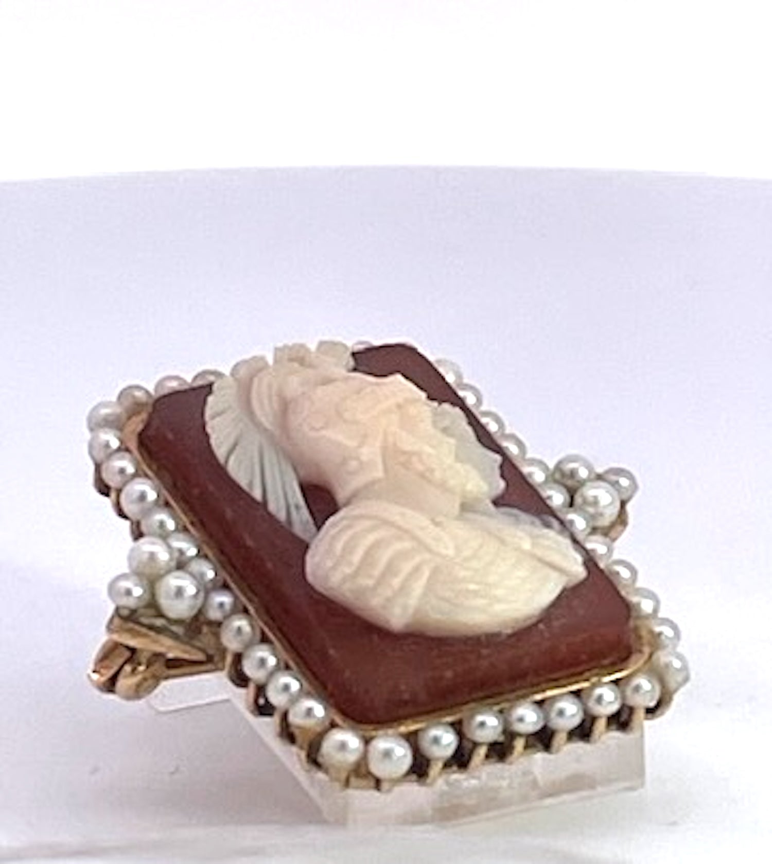 This gorgeous Cameo depicts Mars and Bellona and was made in 1890. It is finely carved and detailed and this is Agate, not shell cameo. This comes out of the United Kingdom were there is more antique jewelry than the States. This piece is done is 14K Yellow Gold and measures 24 x 16 mm and it is surrounded in Oriental Pearls. and the length is 30mm and weight is 12.8 grams. This is a brooch and also a pendant on the back you can see a loop for a chain as well as a pin. It is also stamped 14K. If you love Cameo's do not miss this, it is stunning and rare and the detailed carvings are finely relief-carved