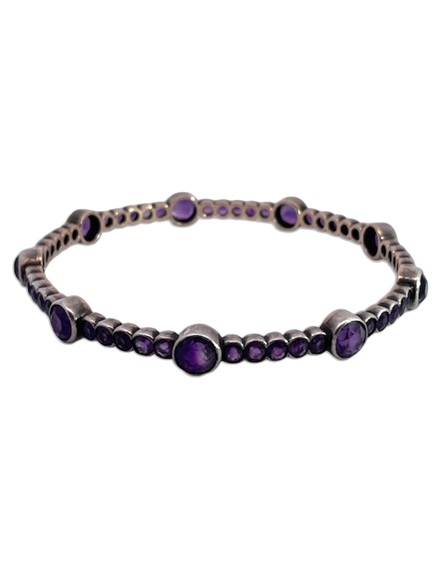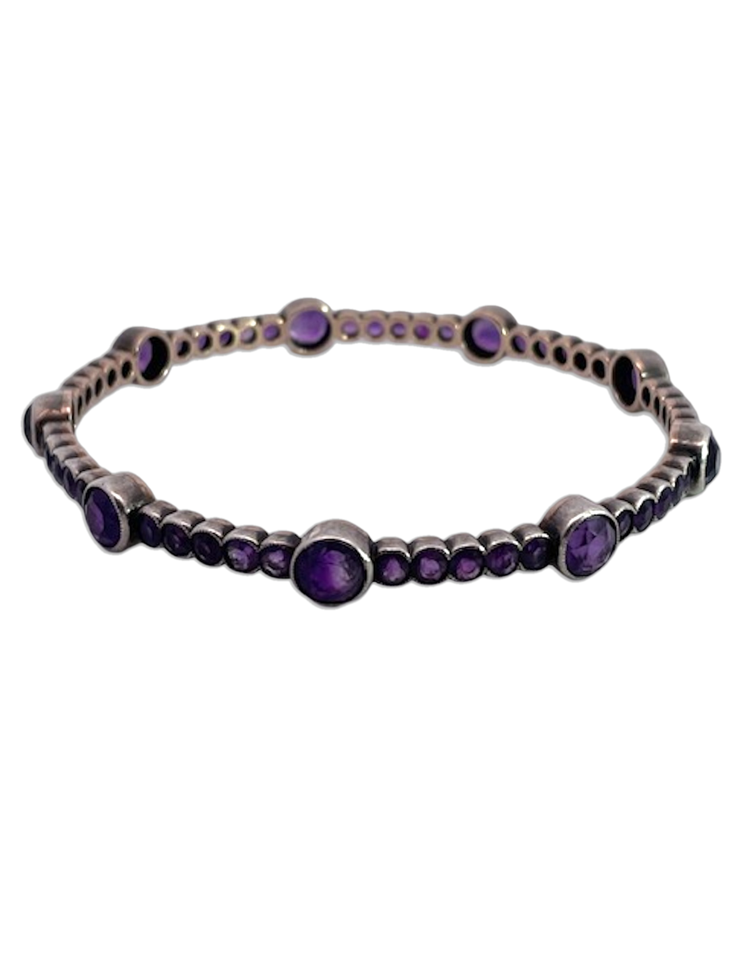 This Amethyst bangle bracelet is rare as we seldom find these bracelets surviving. This is beautiful as it alternates between large Amethyst and smaller ones throughout this bracelet. There are 9 large Amethysts at 0.65 points and approximate weight is 6.75 Carats. and 5 smaller Amethysts at 0.15 points each, between the larger Amethysts. Total small Amet...