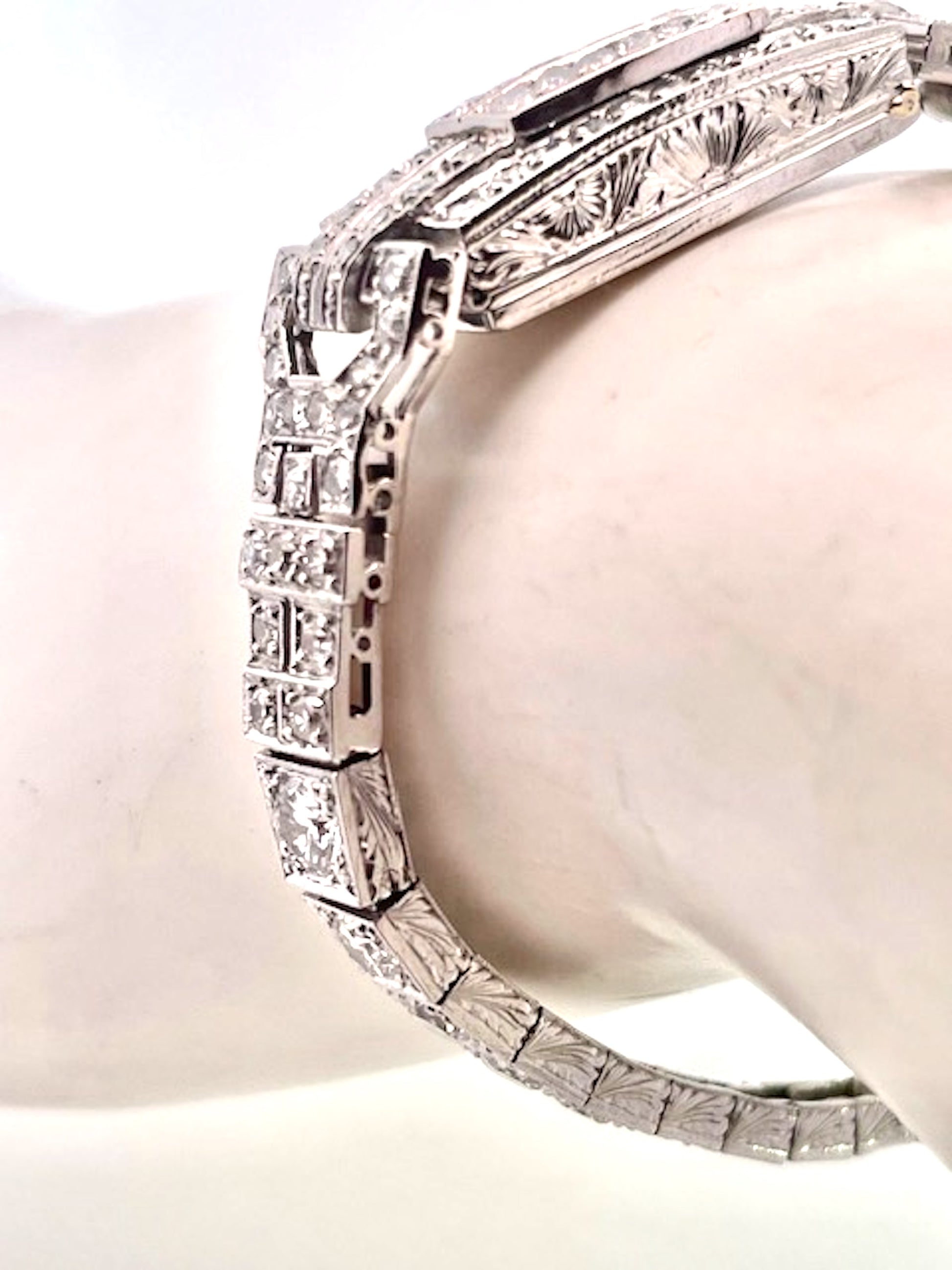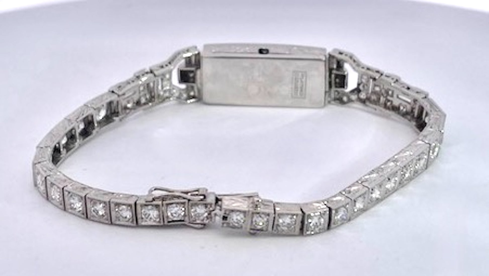 This gorgeous bracelet started out as a Guen ladies watch. I converted it to a beautiful bracelet. This bracelet is covered in Diamonds approximately 3 carats and they are brilliant probably D to G color and VVS1 clarity. This bracelet is both 14K and Platinum fits beautifully nice an smooth without prongs getting in the way. This measures 6.5 wrist a...
