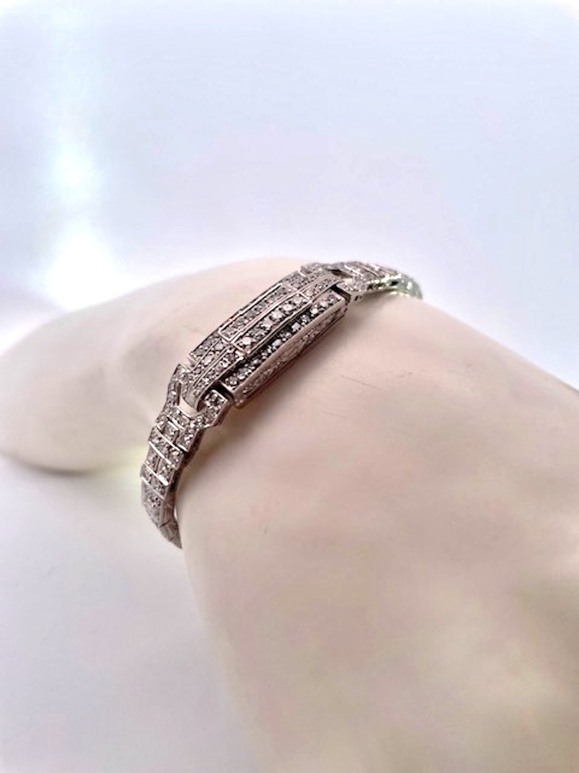Art Deco bracelets are hard to find in good condition and especially those with a wider center and straight line bracelet this is just that and it is gorgeous. I think every women needs a deco line bracelet or a bracelet such as this, it works with everything and it just is stunning.