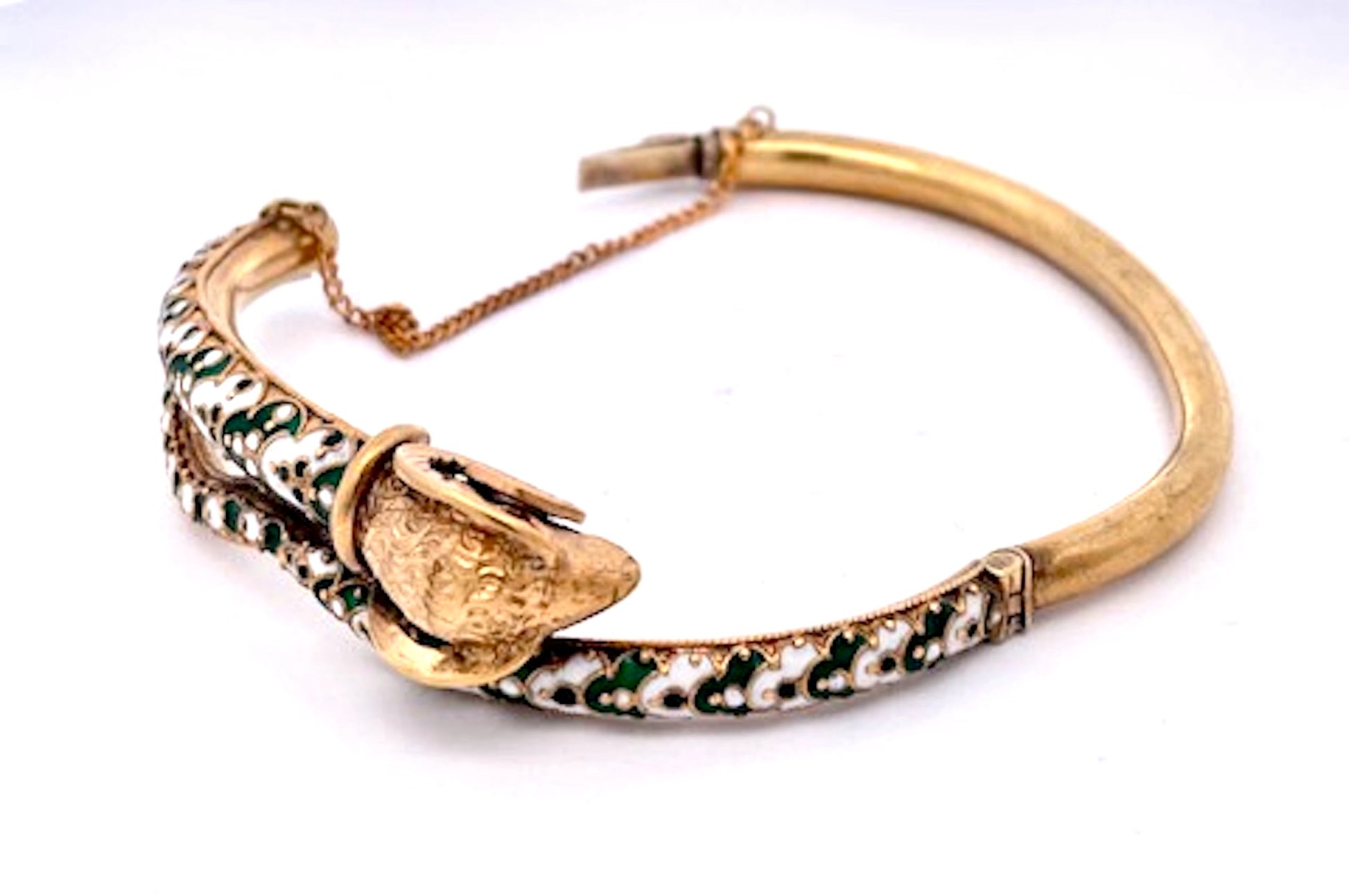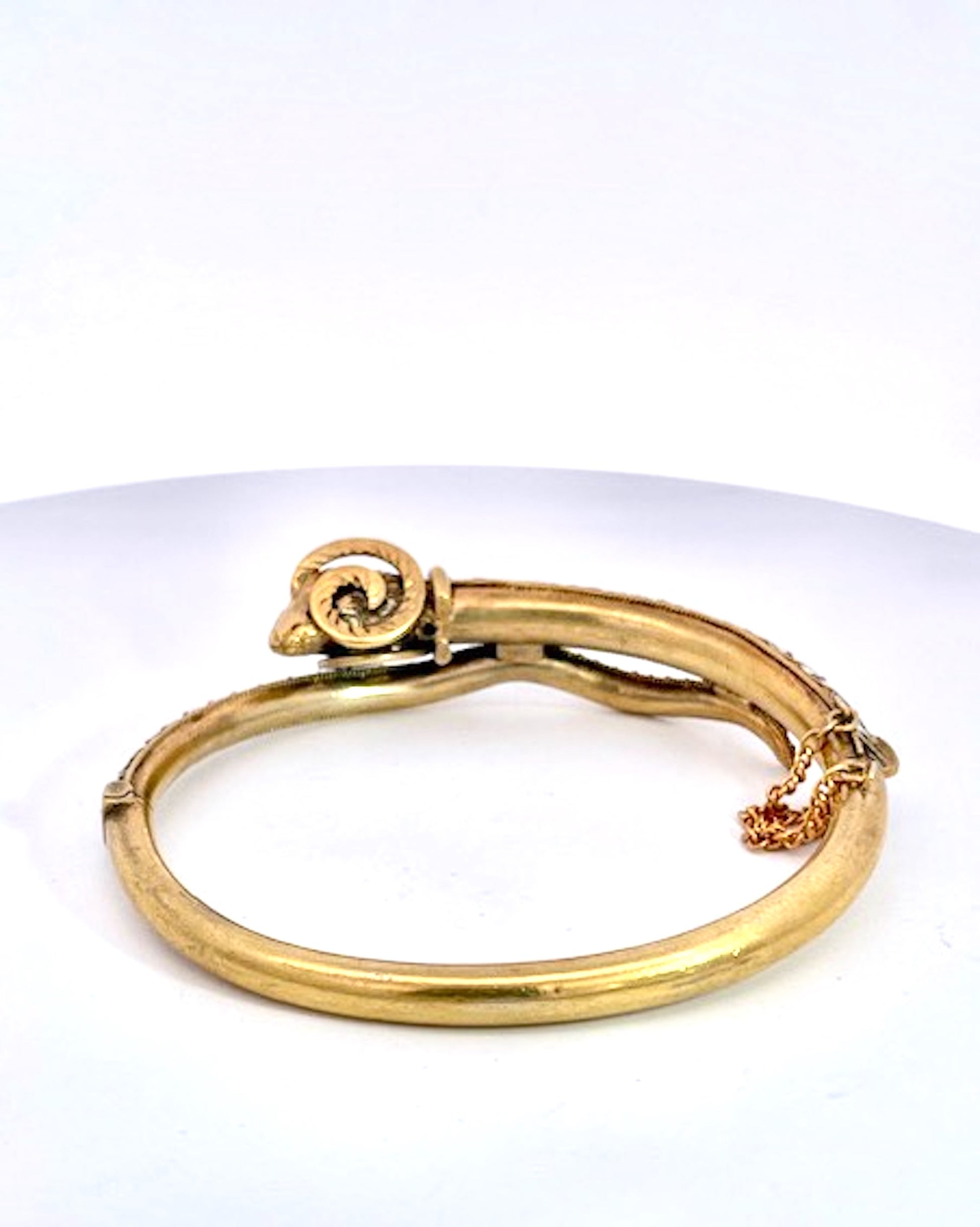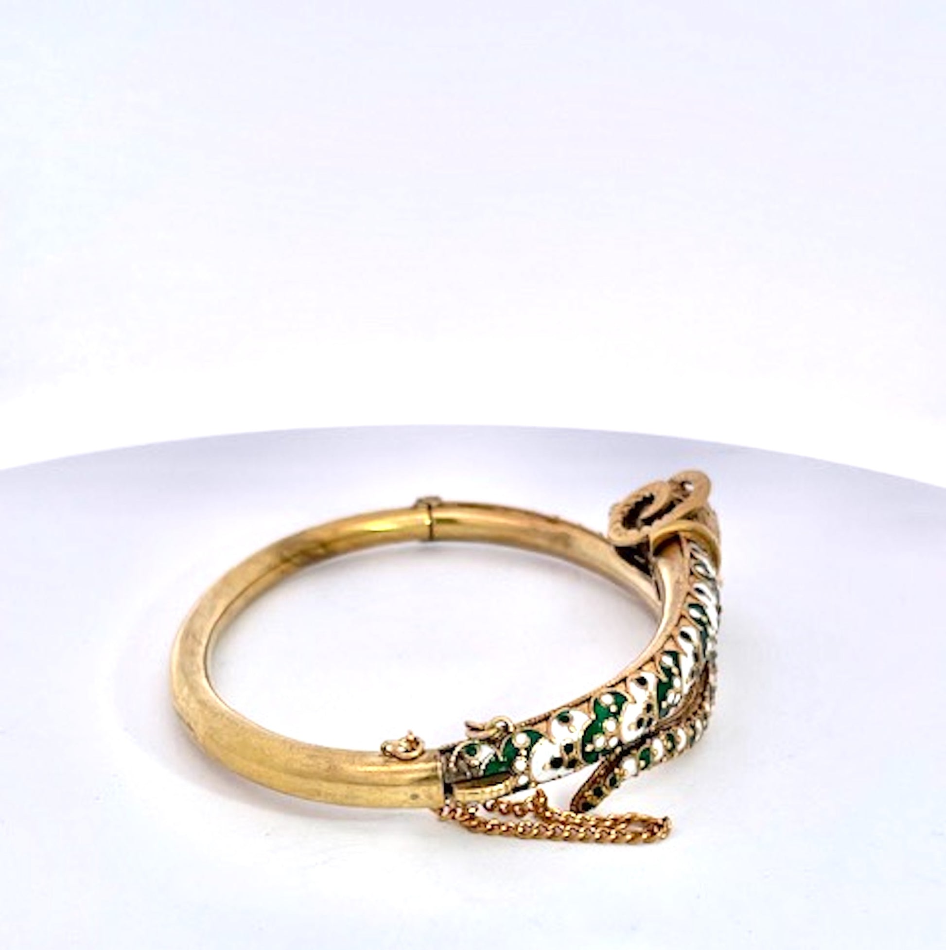 This enamel Rams head bracelet is done in enamel with textured details. The back is smooth the front is highly detailed. This fits a size 6.5 wrist and it weighs 27.60 grams. The Rams body is green and white enamel with high relief detail and the tail is white and green dots. The Rams head and horns are detailed and quite beautiful. This bracelet is from the United Kingdom where antique jewelry is often the best and unique due to the abundance unlike the USA, a new Country that only goes back 300 years. If you love Rams and are an Aries lover do not wait as this will be gone fast. Ask any questions you may have and I will answer.