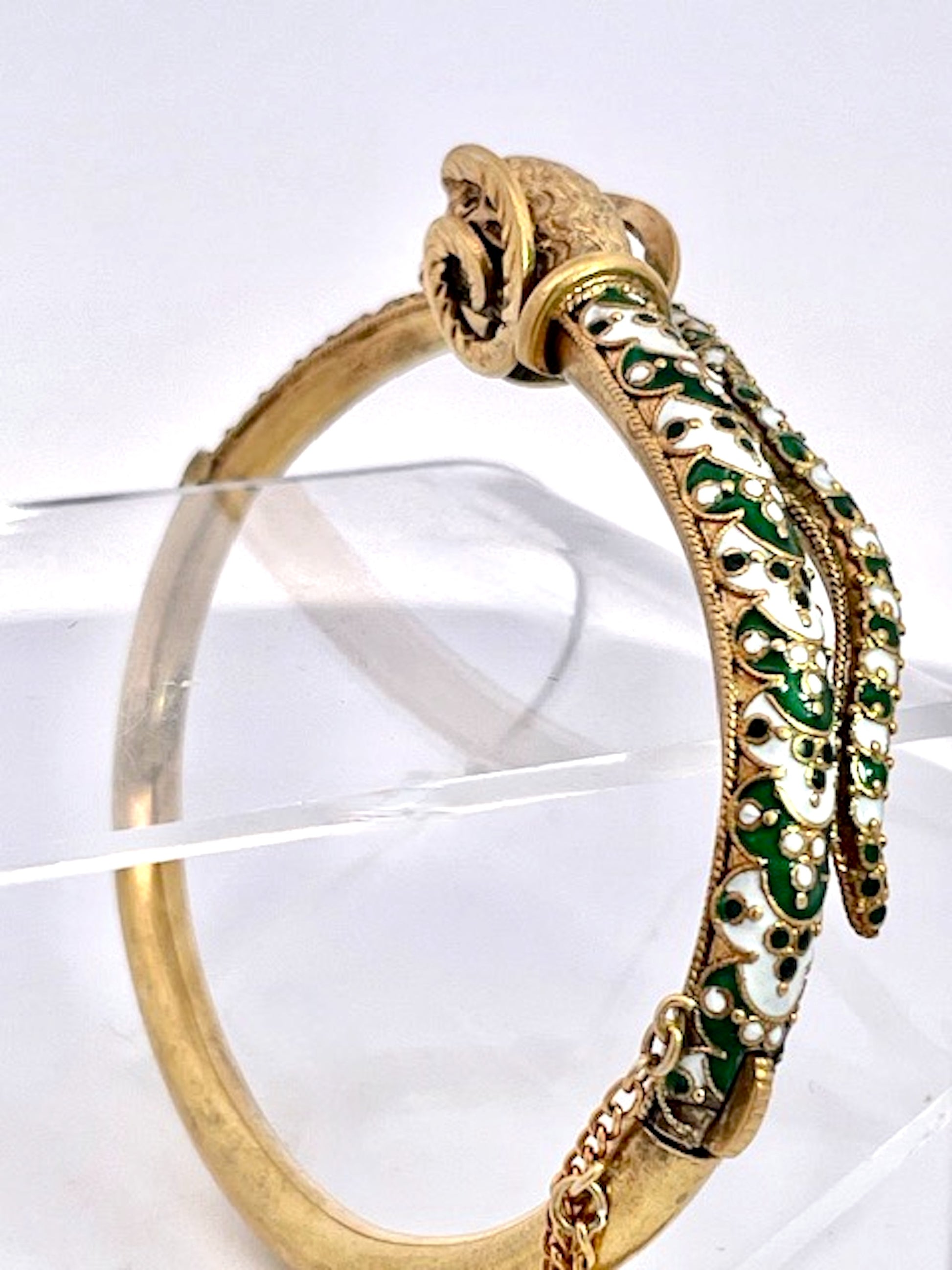 This enamel Rams head bracelet is done in enamel with textured details. The back is smooth the front is highly detailed. This fits a size 6.5 wrist and it weighs 27.60 grams. The Rams body is green and white enamel with high relief detail and the tail is white and green dots. The Rams head and horns are detailed and quite beautiful. This bracelet is fr...