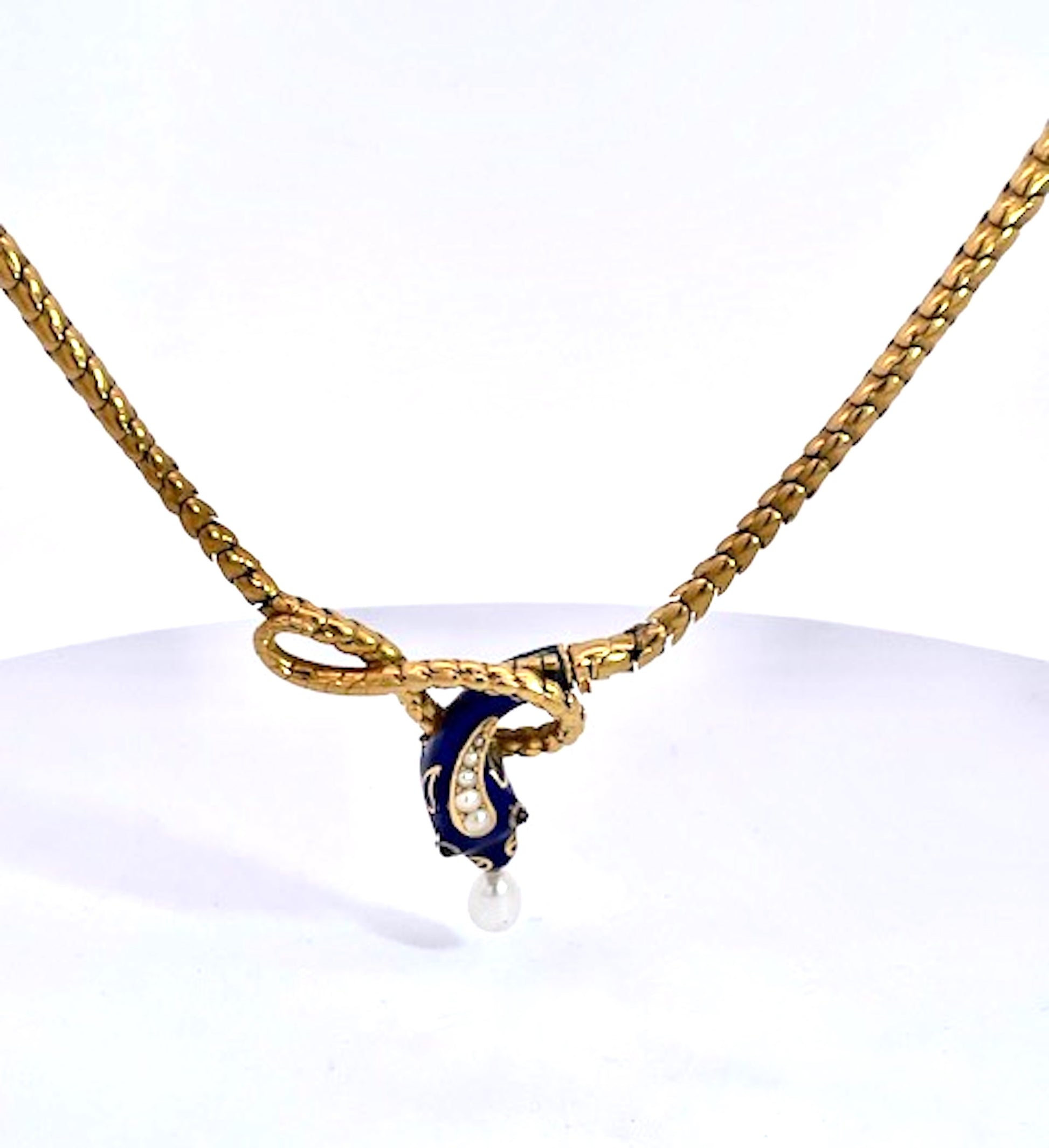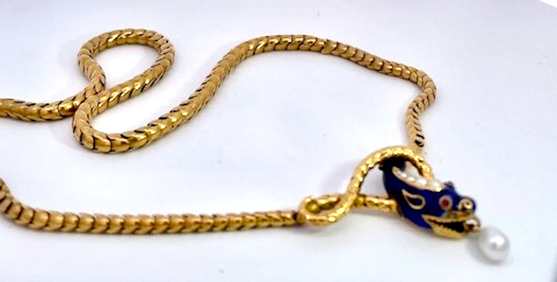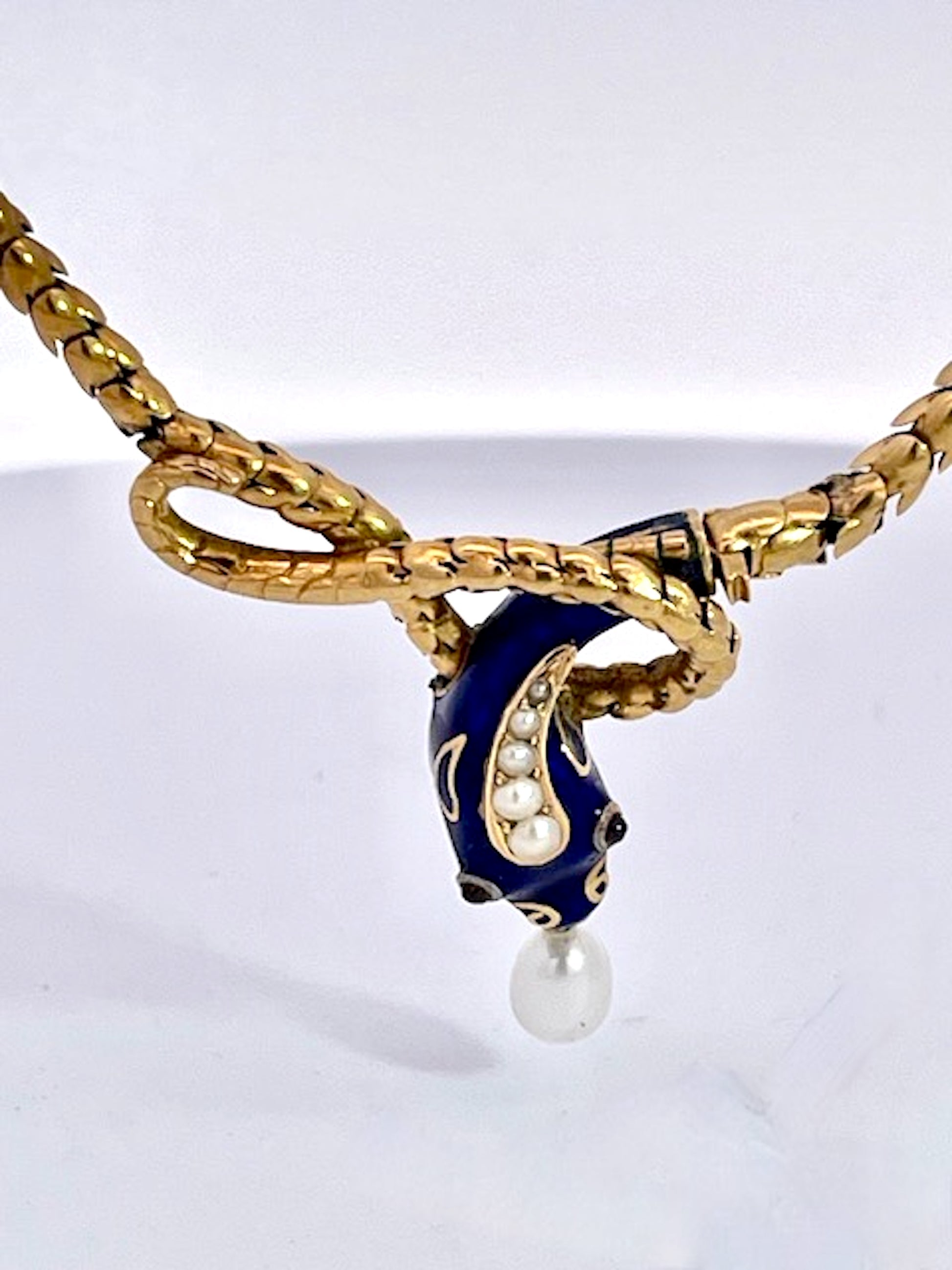 This gorgeous Blue enamel Snake necklace is fabulous. It is 17" which s better than most as they tend to run small like 15" which is too small for most women of today. This snake has a beautiful face with four (4) pearls on his head and a nice pearl drop from his mouth. In addition it has 2 cabochon Garnet eyes. There is a tiny bit of enamel loss on one...