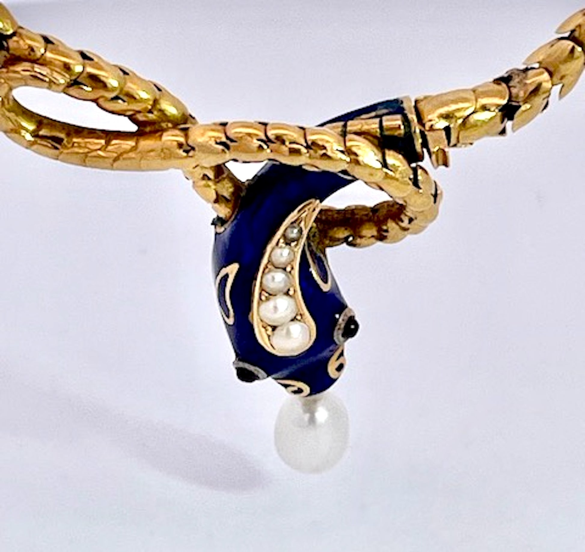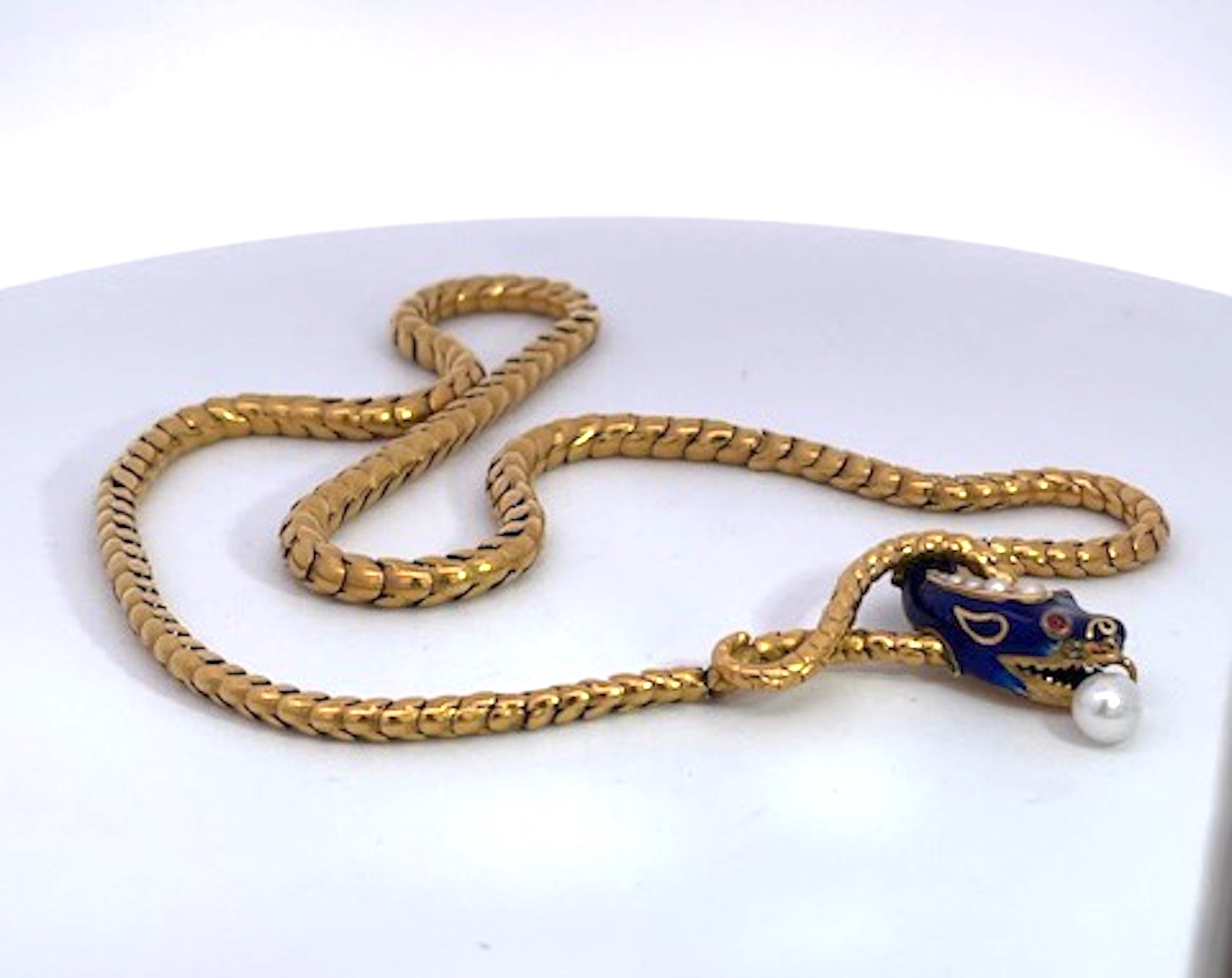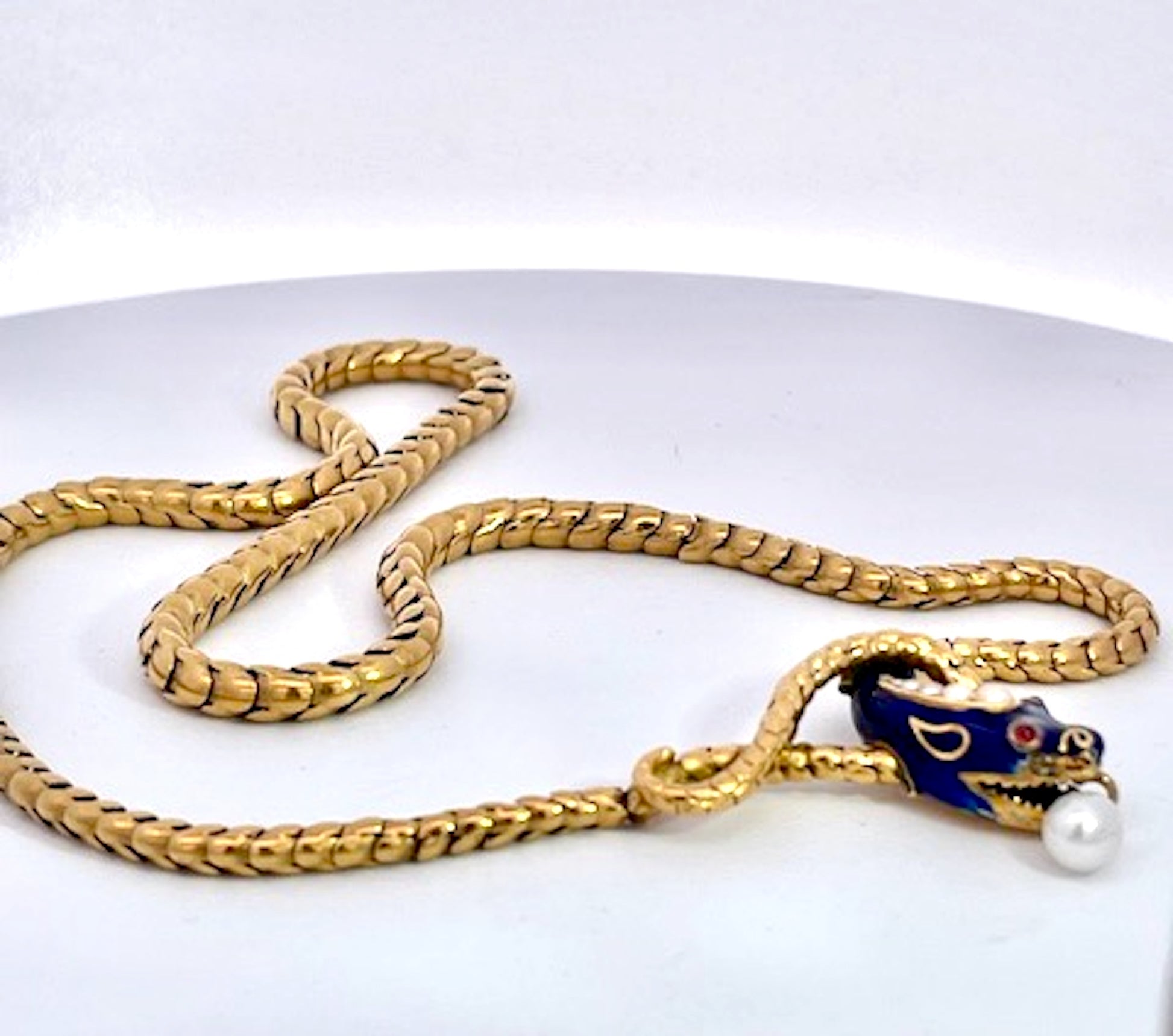 This gorgeous Blue enamel Snake necklace is fabulous. It is 17" which s better than most as they tend to run small like 15" which is too small for most women of today. This snake has a beautiful face with four (4) pearls on his head and a nice pearl drop from his mouth. In addition it has 2 cabochon Garnet eyes. There is a tiny bit of enamel loss on one...