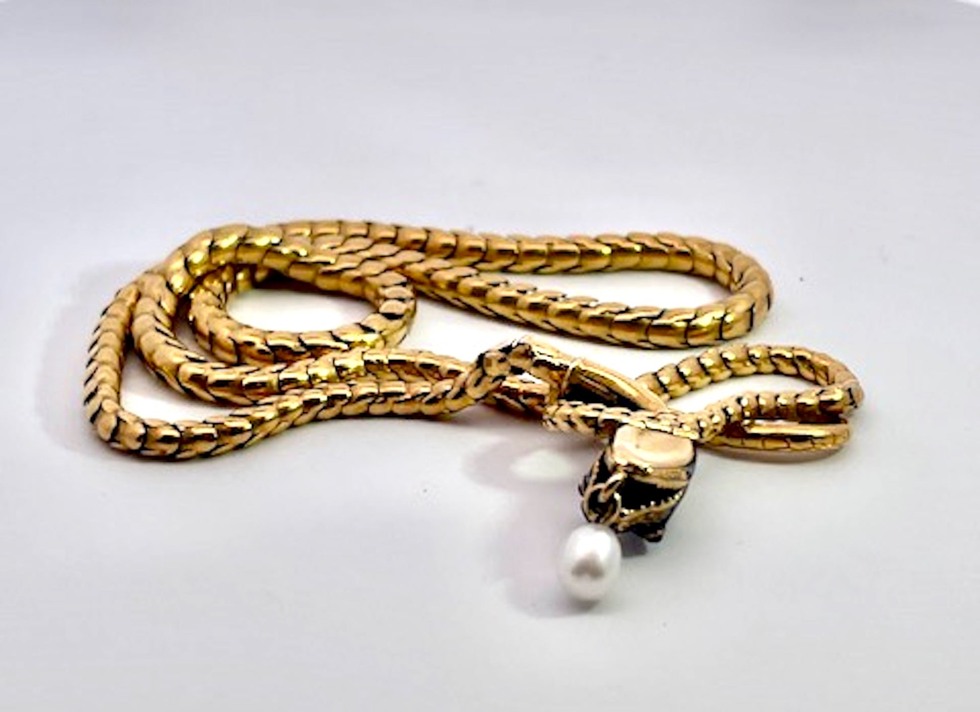This gorgeous Blue enamel Snake necklace is fabulous. It is 17" which s better than most as they tend to run small like 15" which is too small for most women of today. This snake has a beautiful face with four (4) pearls on his head and a nice pearl drop from his mouth. In addition it has 2 cabochon Garnet eyes. There is a tiny bit of enamel loss on one side of his face but it does not distract from the beauty of this piece. The chain graduates in size and is fully articulated. this is 15K yellow gold and weights 24.20 grams. This matches perfectly with several other snake bracelets listed, so if you want a matching set, it is here.