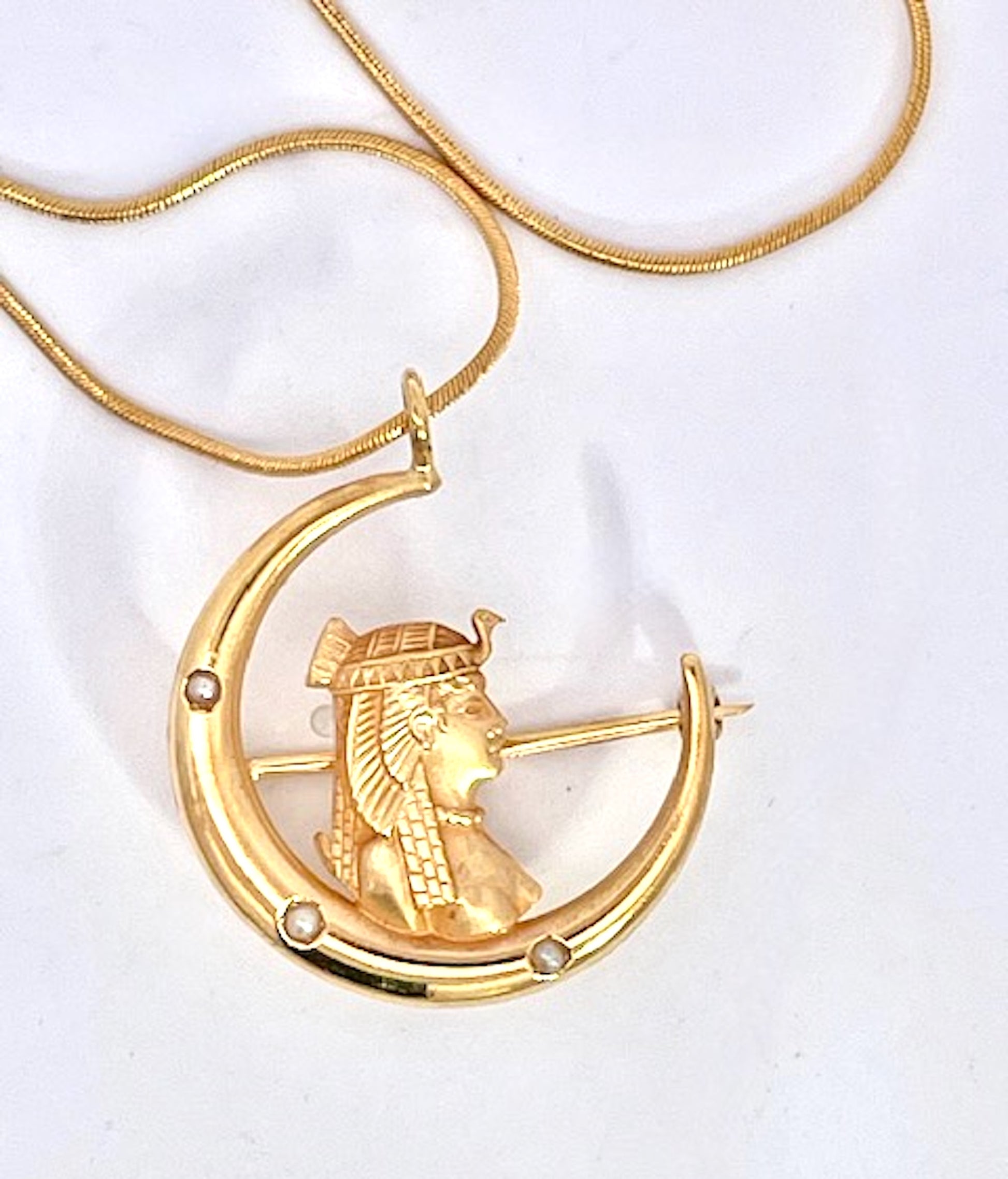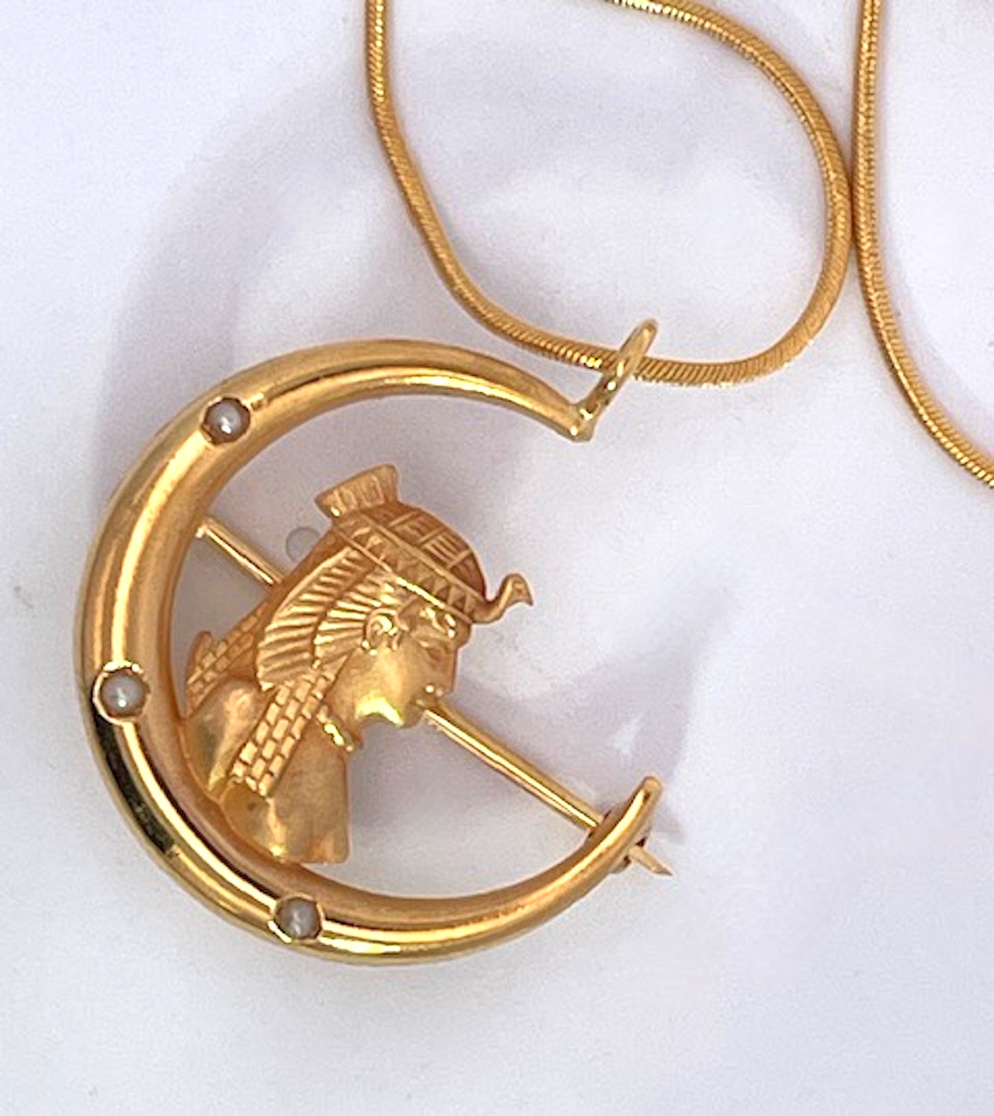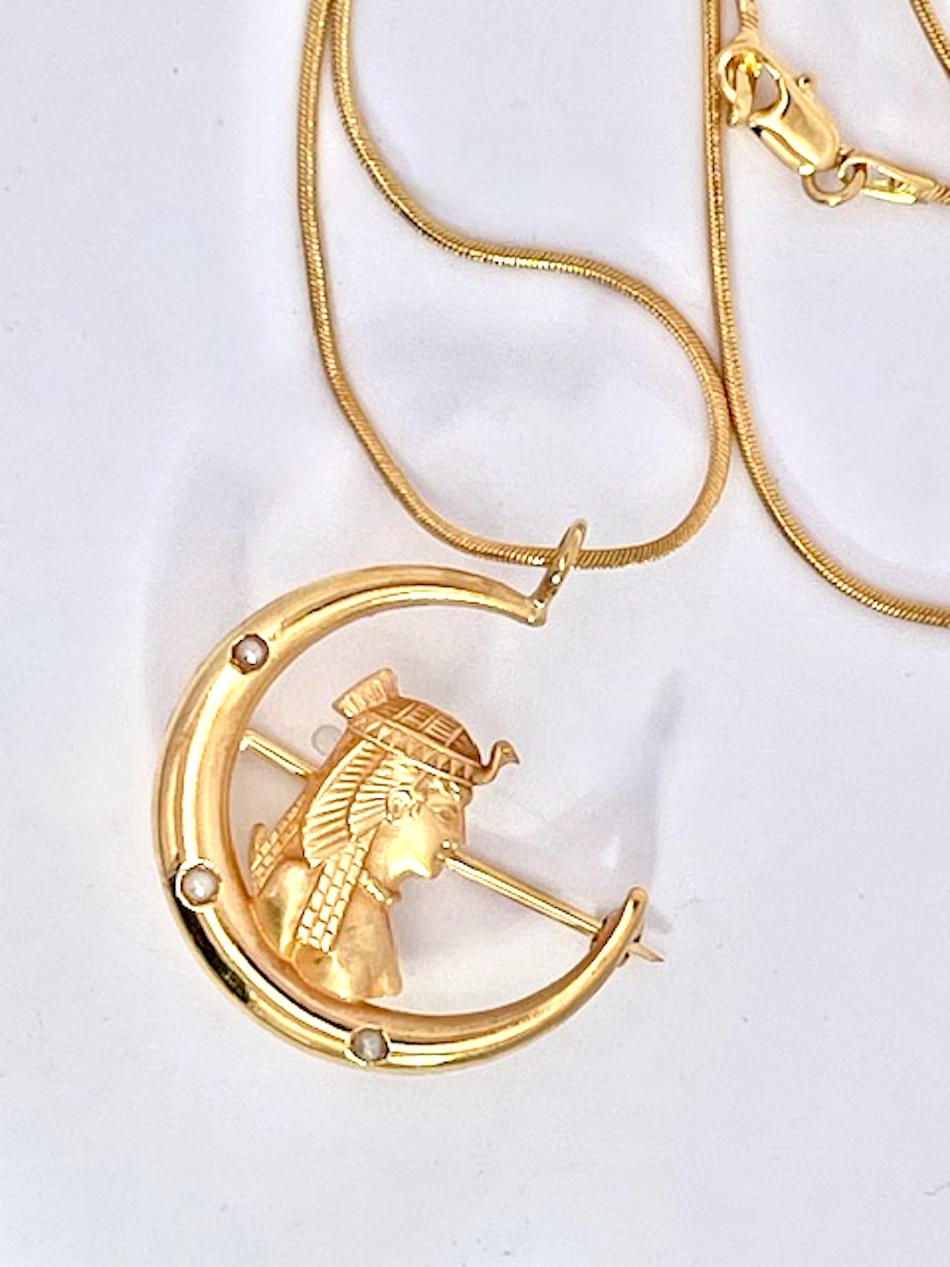 This Pharaoh started life as a pin which I converted into a necklace. The details are amazing. The face is detailed and carved into a lovely expression this 14K Yellow Gold and it has three (3) seed pearls inlaid onto the crescent. This is simple but packs a bang. You can wear this as a brooch by removing the chain, or as a necklace as shown and what ...