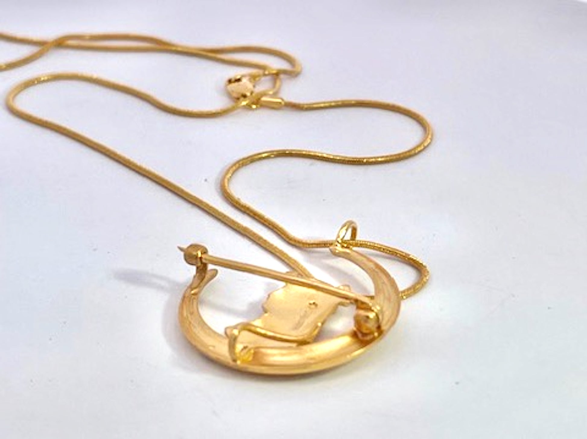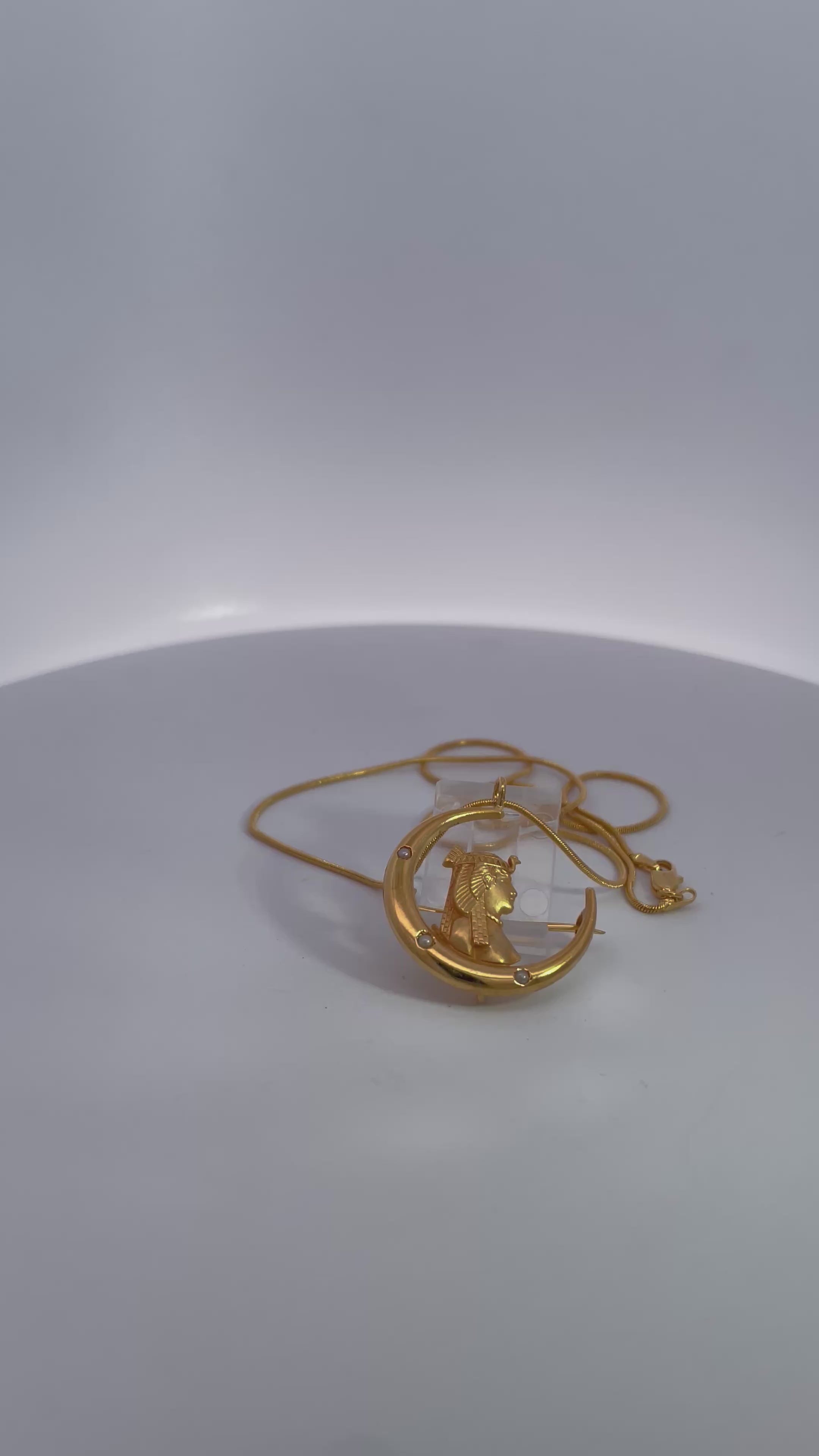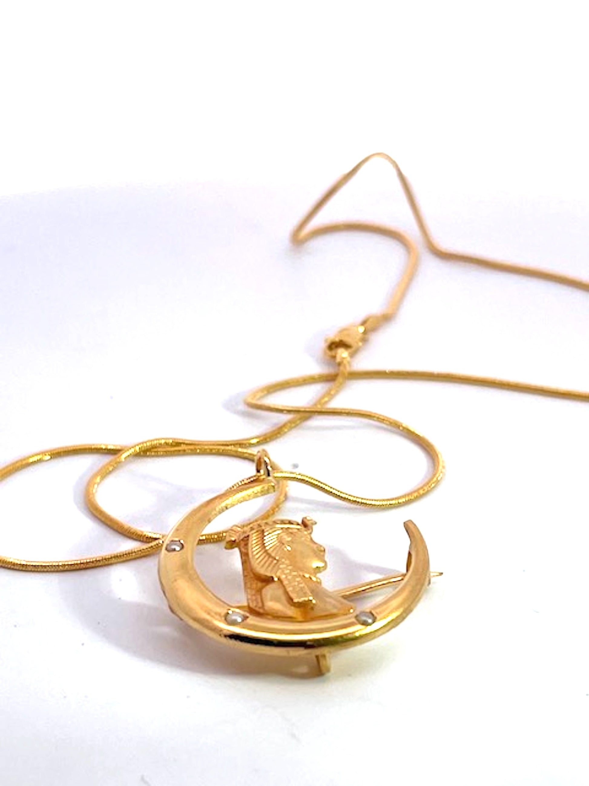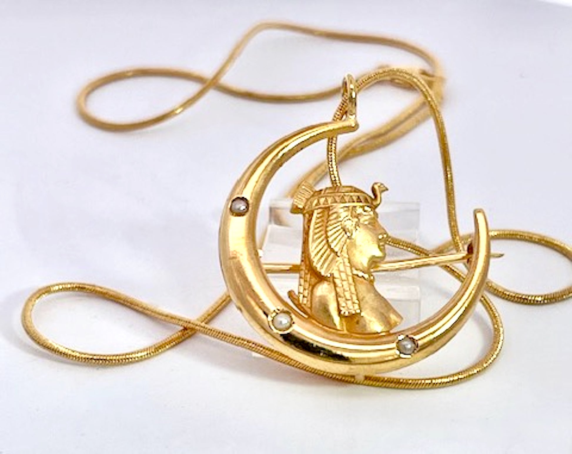 This Pharaoh started life as a pin which I converted into a necklace. The details are amazing. The face is detailed and carved into a lovely expression this 14K Yellow Gold and it has three (3) seed pearls inlaid onto the crescent. This is simple but packs a bang. You can wear this as a brooch by removing the chain, or as a necklace as shown and what ...