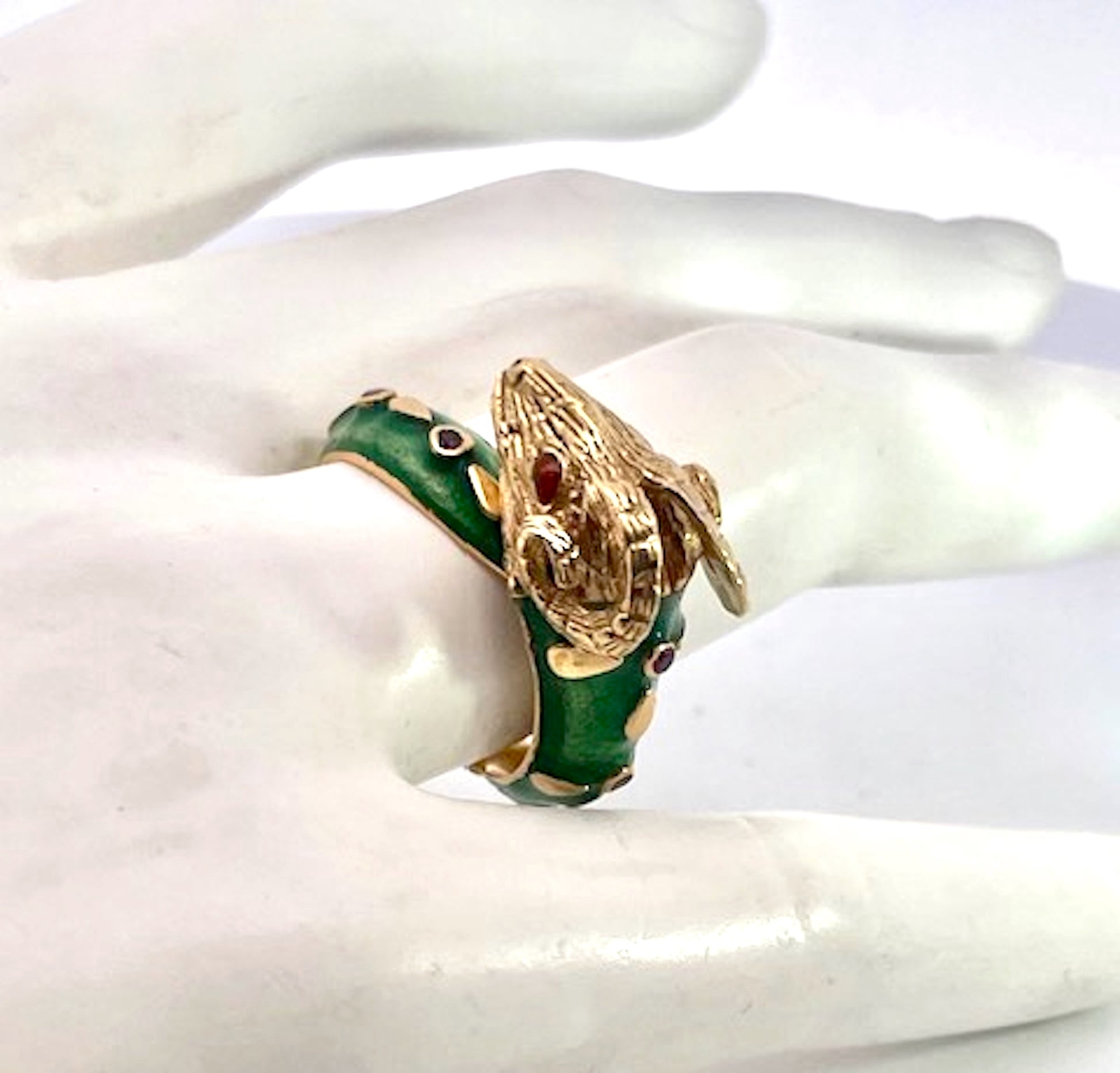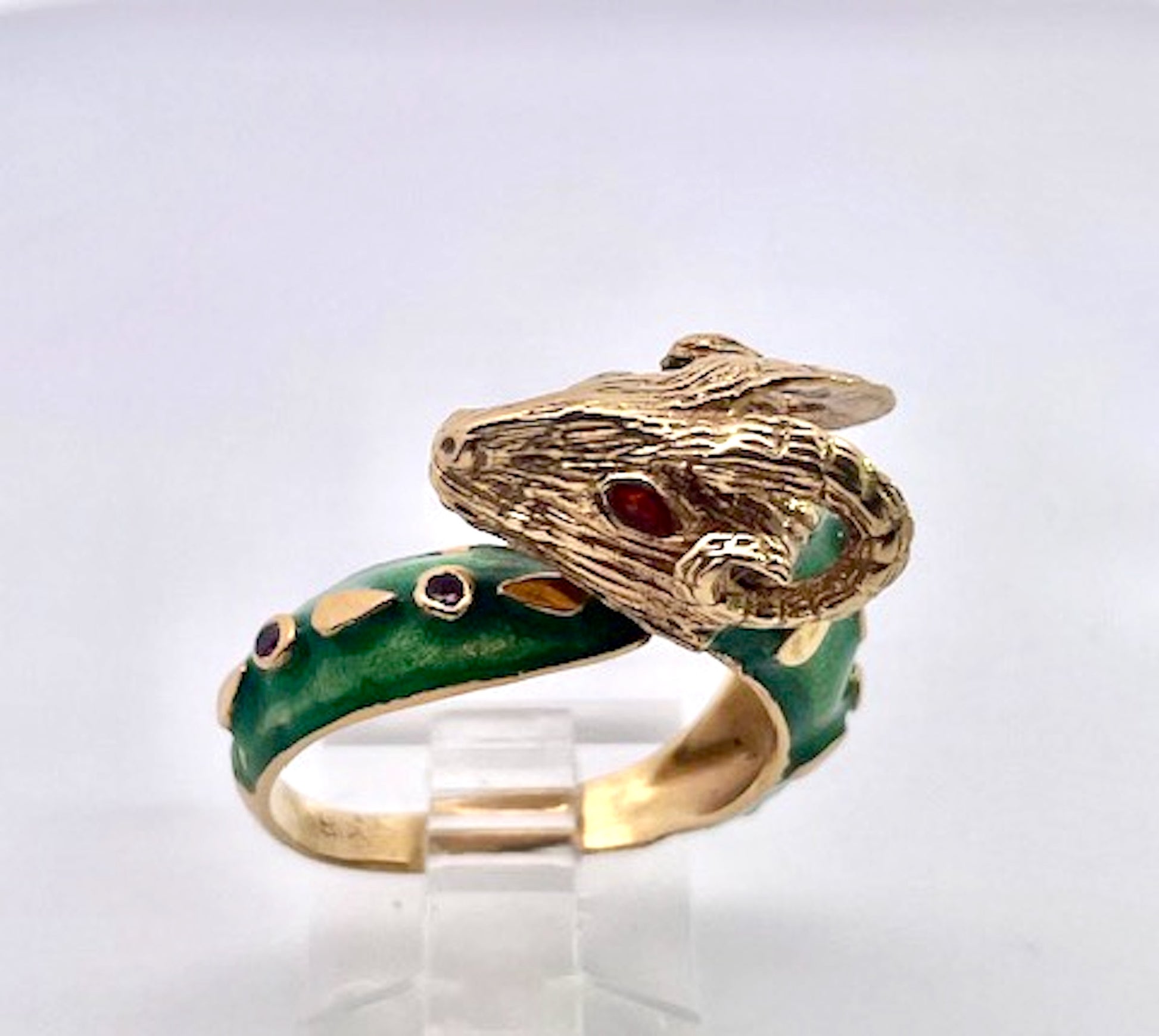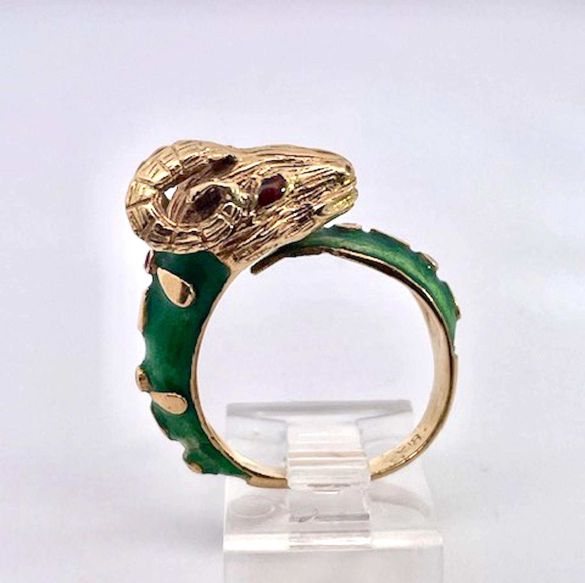 This enamel Rams ring is very special.  It is enameled in Green with Ruby accents throughout.  This ring is used and the band is a bit out of shape but definitely wearable.  It has two rubies on the shank and the eyes have two Rubies, also it has gold detailing on the shank and band.  There is a tiny bit of enamel loss but it does not distract from the beauty of this ring.  This is a size 8 and can be made smaller and the band can be reshaped to a round form. It also weighs in at 8.9 grams.  I purchased this as both 14K and 18K but I do not know what part is 14K and which part is 18K but I don't think it matters.