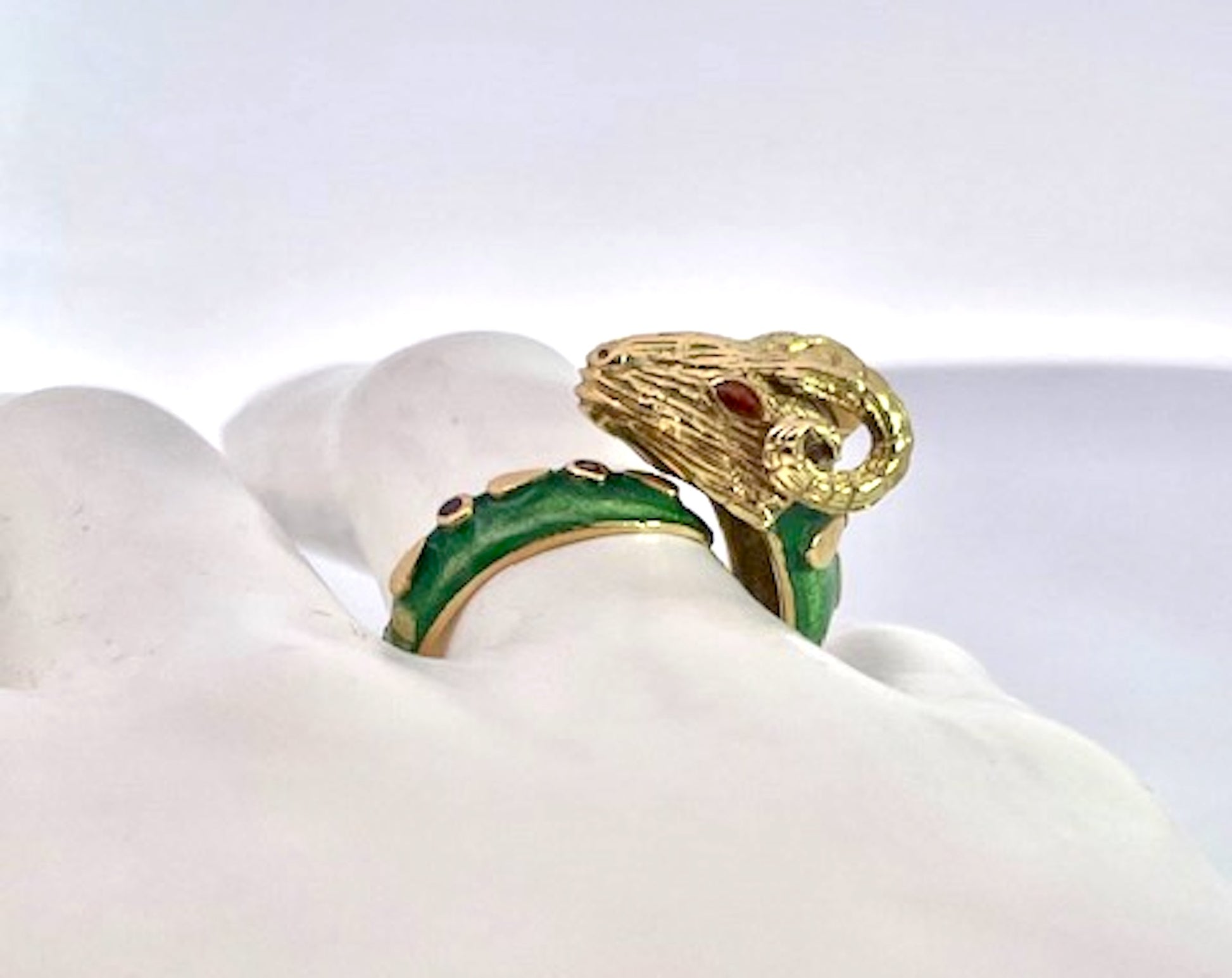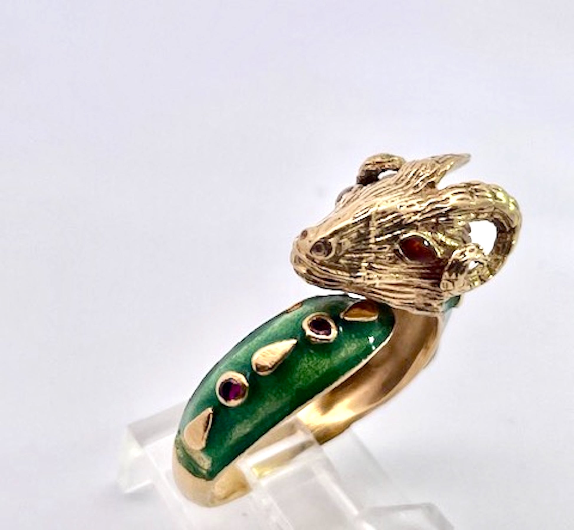 This enamel Rams ring is very special.  It is enameled in Green with Ruby accents throughout.  This ring is used and the band is a bit out of shape but definitely wearable.  It has two rubies on the shank and the eyes have two Rubies, also it has gold detailing on the shank and band.  There is a tiny bit of enamel loss but it does not distract from the be...
