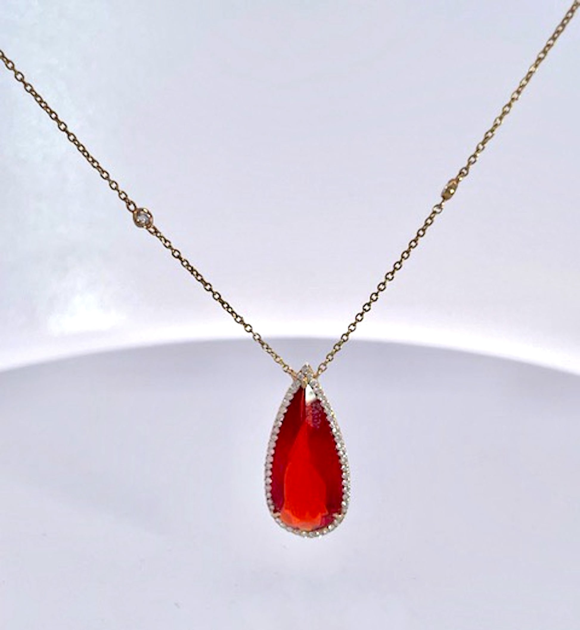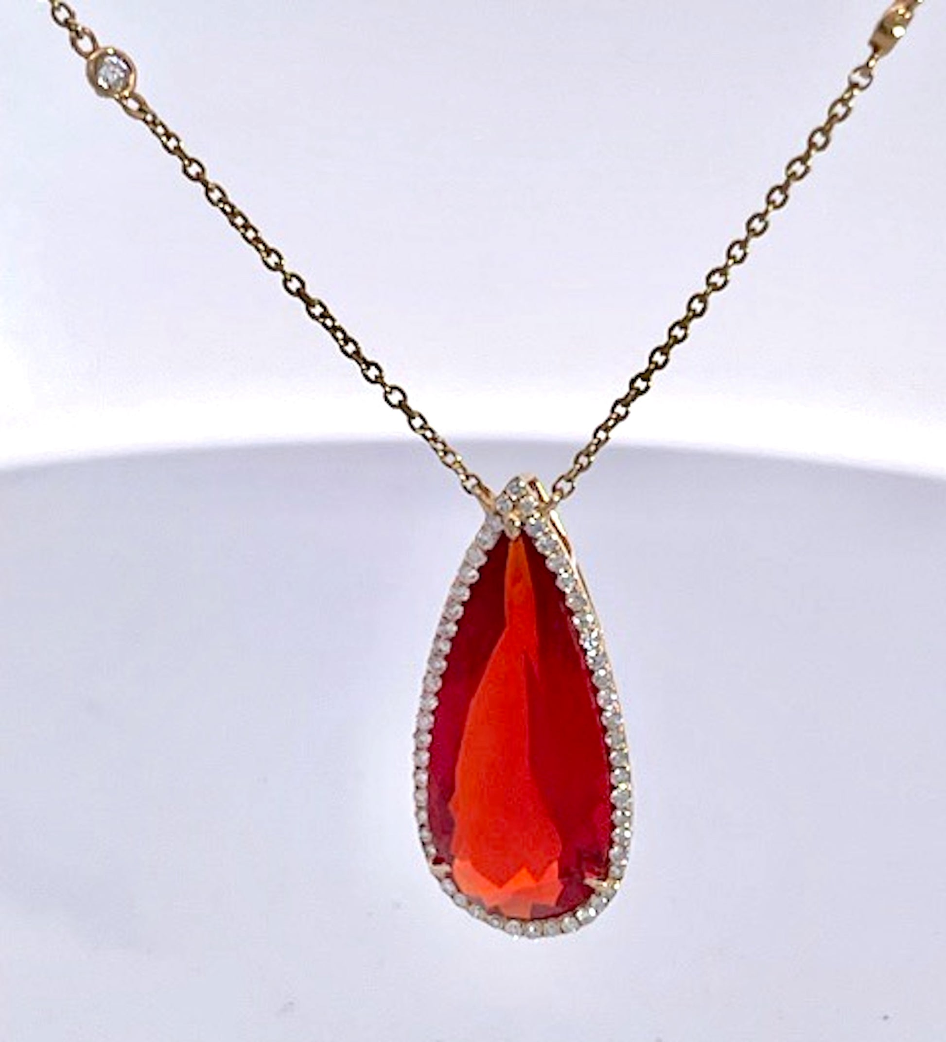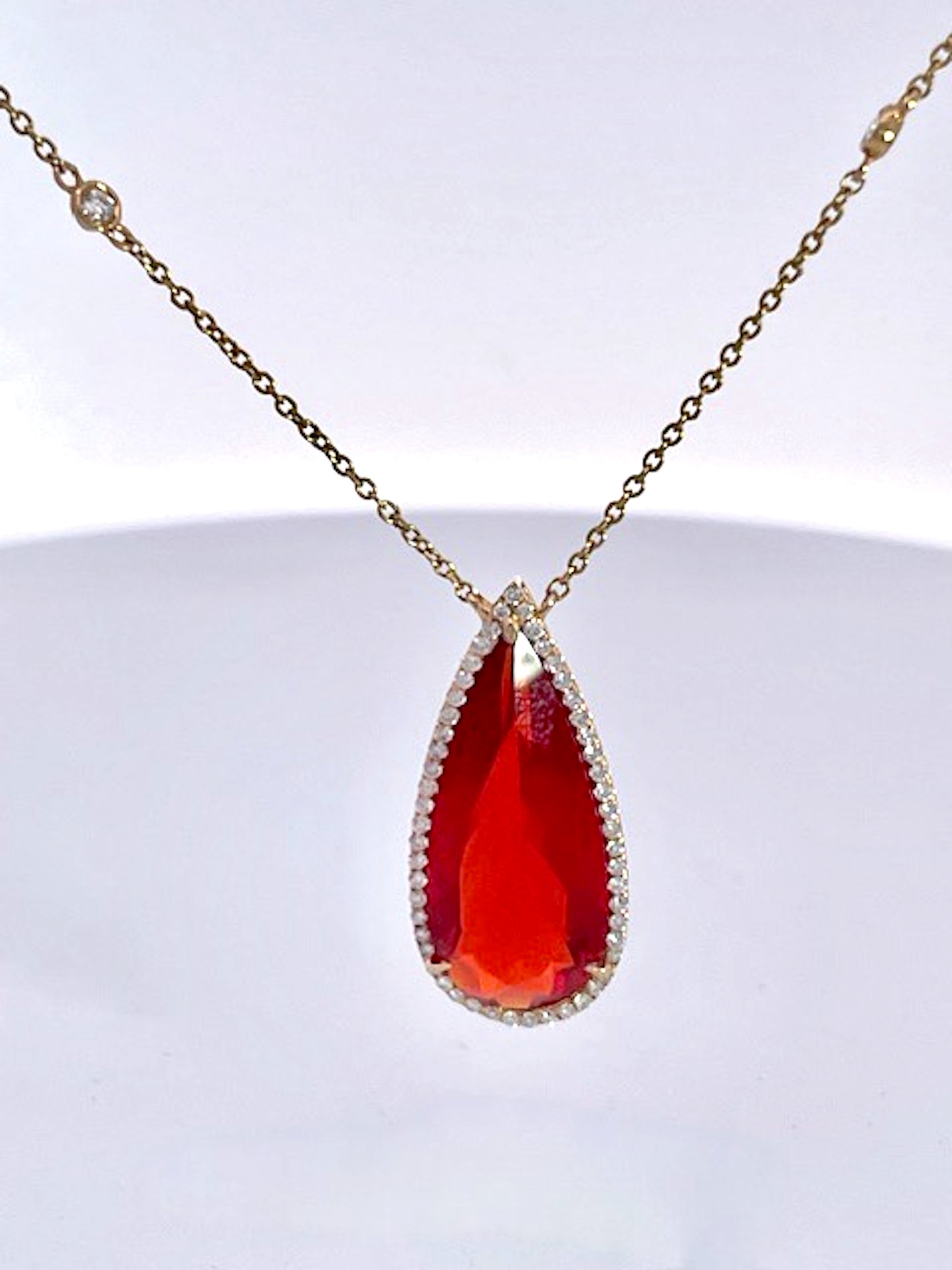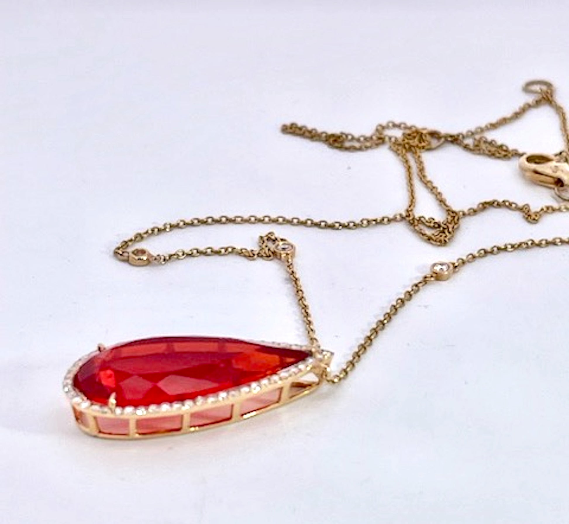 This Fire Opal pendant is rare because it is faceted.  Most Fire Opal are Cabochon cut not faceted..  Also Fire Opal are only found in Mexico, I found some in Cabo but this one comes out of the U.K.  This Opal is 8 carats very substantial and includes a Diamond surround and two Diamonds on the chain.  This chain is 18" long the Diamonds total .50 carats. ...