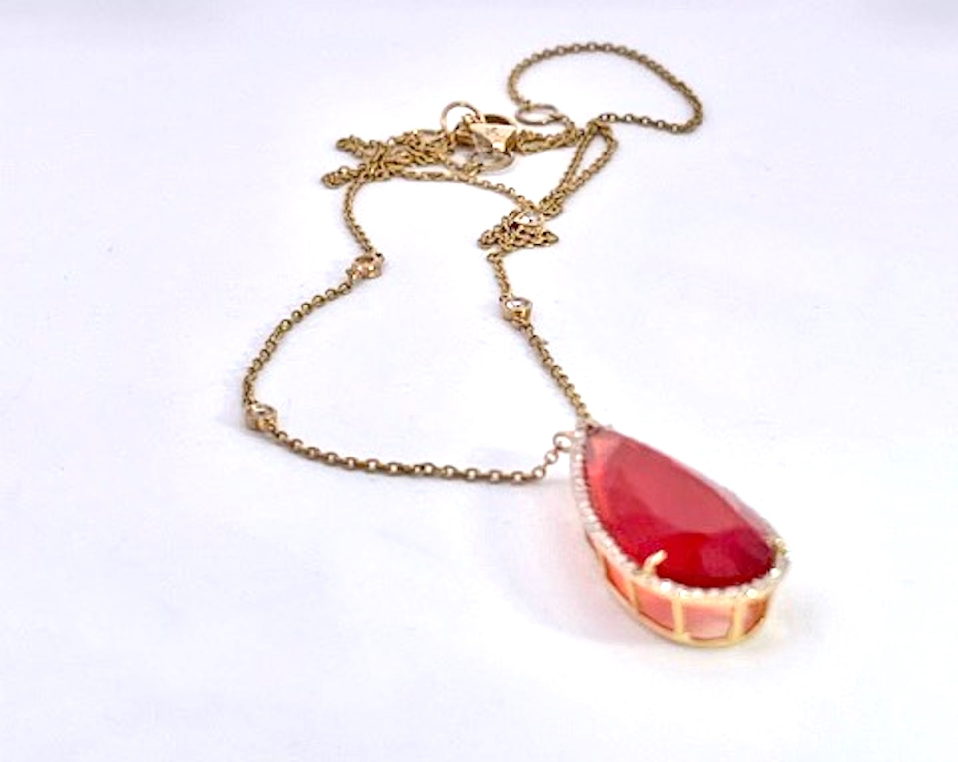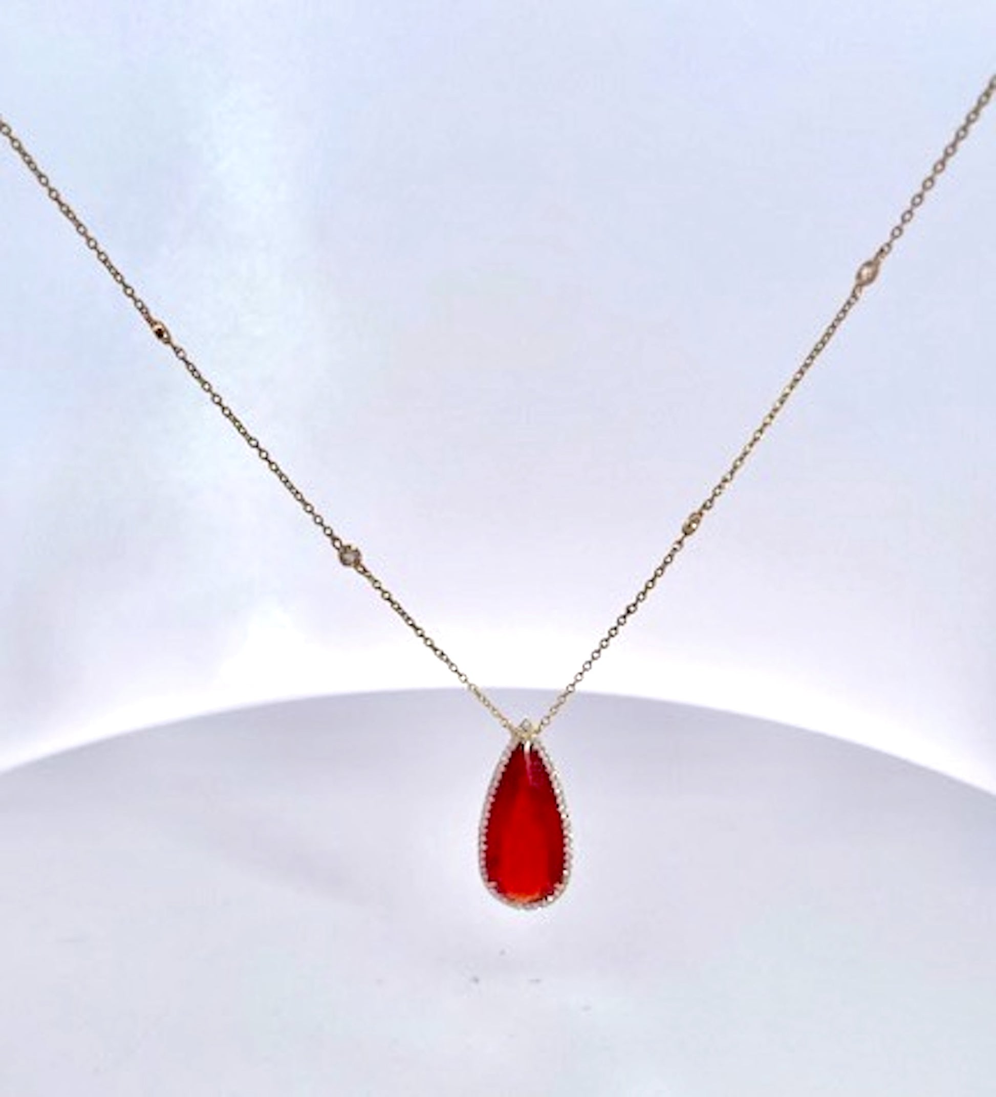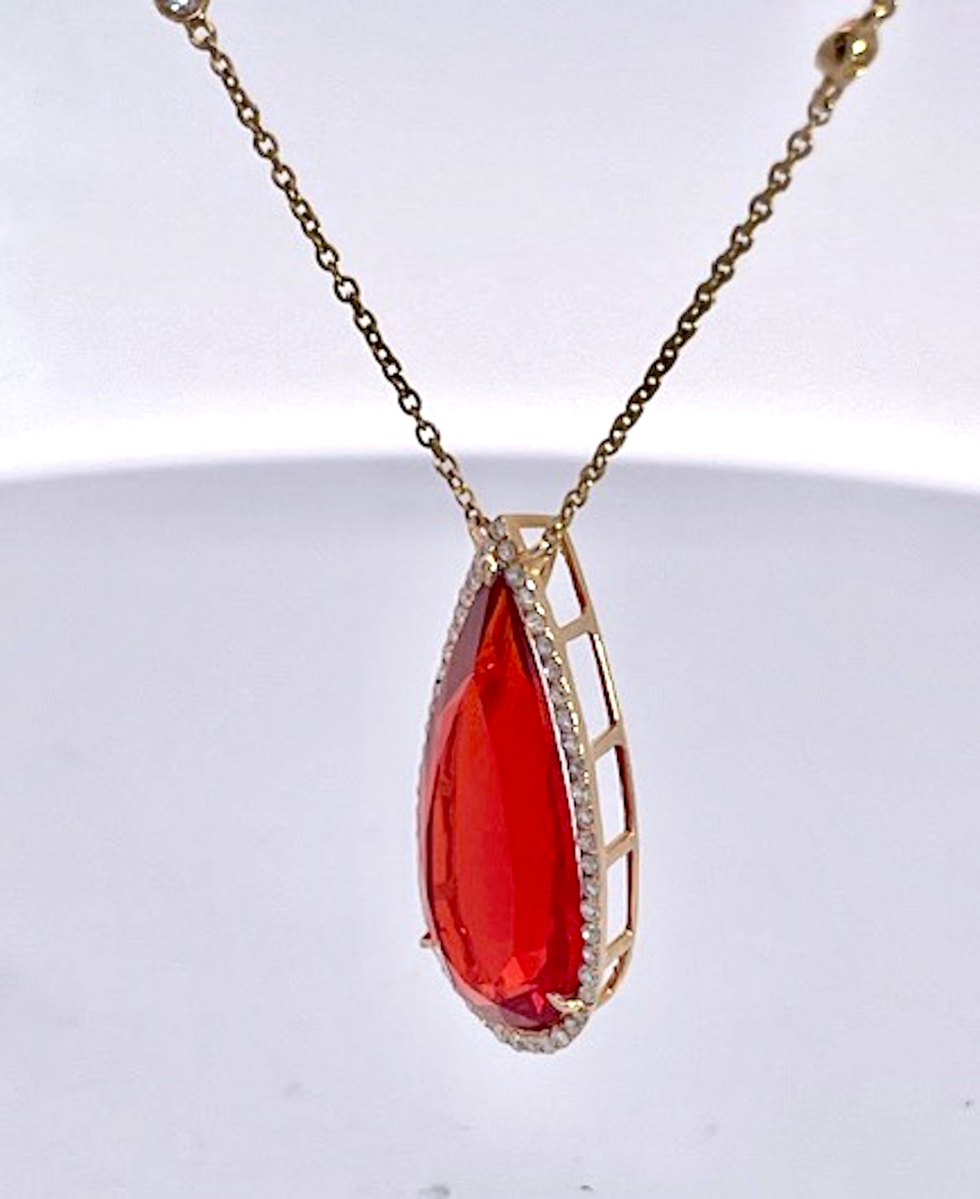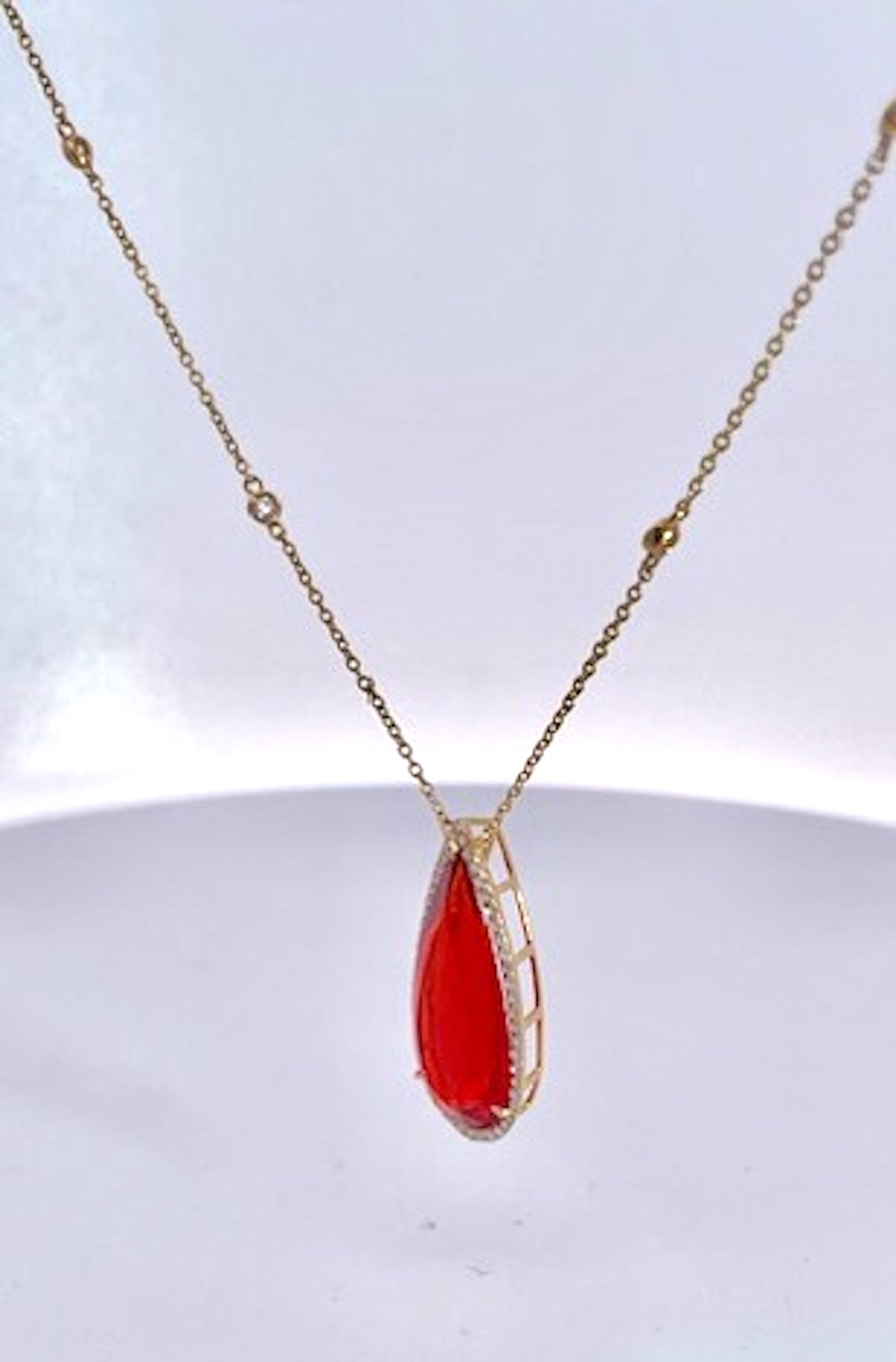 This Fire Opal pendant is rare because it is faceted.  Most Fire Opal are Cabochon cut not faceted..  Also Fire Opal are only found in Mexico, I found some in Cabo but this one comes out of the U.K.  This Opal is 8 carats very substantial and includes a Diamond surround and two Diamonds on the chain.  This chain is 18" long the Diamonds total .50 carats. ...